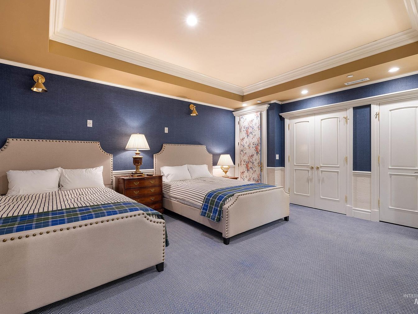 A spacious guest bedroom features two elegant upholstered beds with studded detailing and neutral tones, topped with crisp white bedding and blue plaid throws for a cozy touch. The deep blue textured walls add depth and sophistication, complemented by white crown molding and warm ceiling accents. A classic wooden nightstand with an ornate lamp sits between the beds, fostering a welcoming and comfortable atmosphere. Wall sconces provide additional lighting, while ample closet space with paneled white doors offers practicality for families. The soft geometric-patterned carpet adds warmth and a family-friendly vibe, making it ideal for siblings or visiting guests.