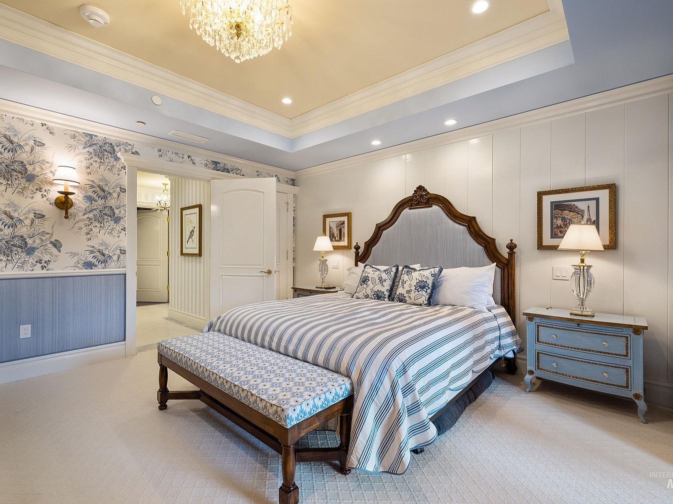 A spacious master bedroom exudes comfort and style with its serene blue and white color scheme. The room features an elegant wooden bed frame with a tall, upholstered headboard and is dressed in striped bedding with floral accent pillows. Vintage-inspired nightstands and classic table lamps provide charm on either side of the bed, complemented by framed artwork. A patterned bench at the bed’s foot enhances both seating and decorative appeal. Soft carpet flooring ensures a cozy, family-friendly atmosphere. The tray ceiling, crowned with a sparkling chandelier, adds a touch of sophistication, while subtle wallpaper and paneling offer visual interest and timeless character.