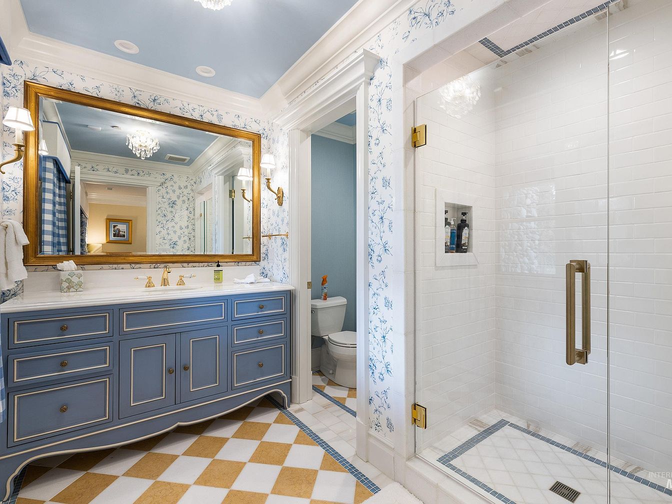 This charming bathroom combines elegance and comfort, featuring a striking blue vanity with gold hardware that provides abundant storage for a family’s needs. The large, gold-framed mirror adds depth and brightness, while coordinating wall sconces offer soft lighting for daily routines. The glass-enclosed shower feels spacious and modern, with pristine white tiles and built-in shelving for convenience. Delicate blue-and-white floral wallpaper gives the space a welcoming, cottage-inspired atmosphere, complemented by a blue ceiling and a checkered tile floor in warm gold and white tones. The layout is both functional and stylish, making it ideal for households of all ages.