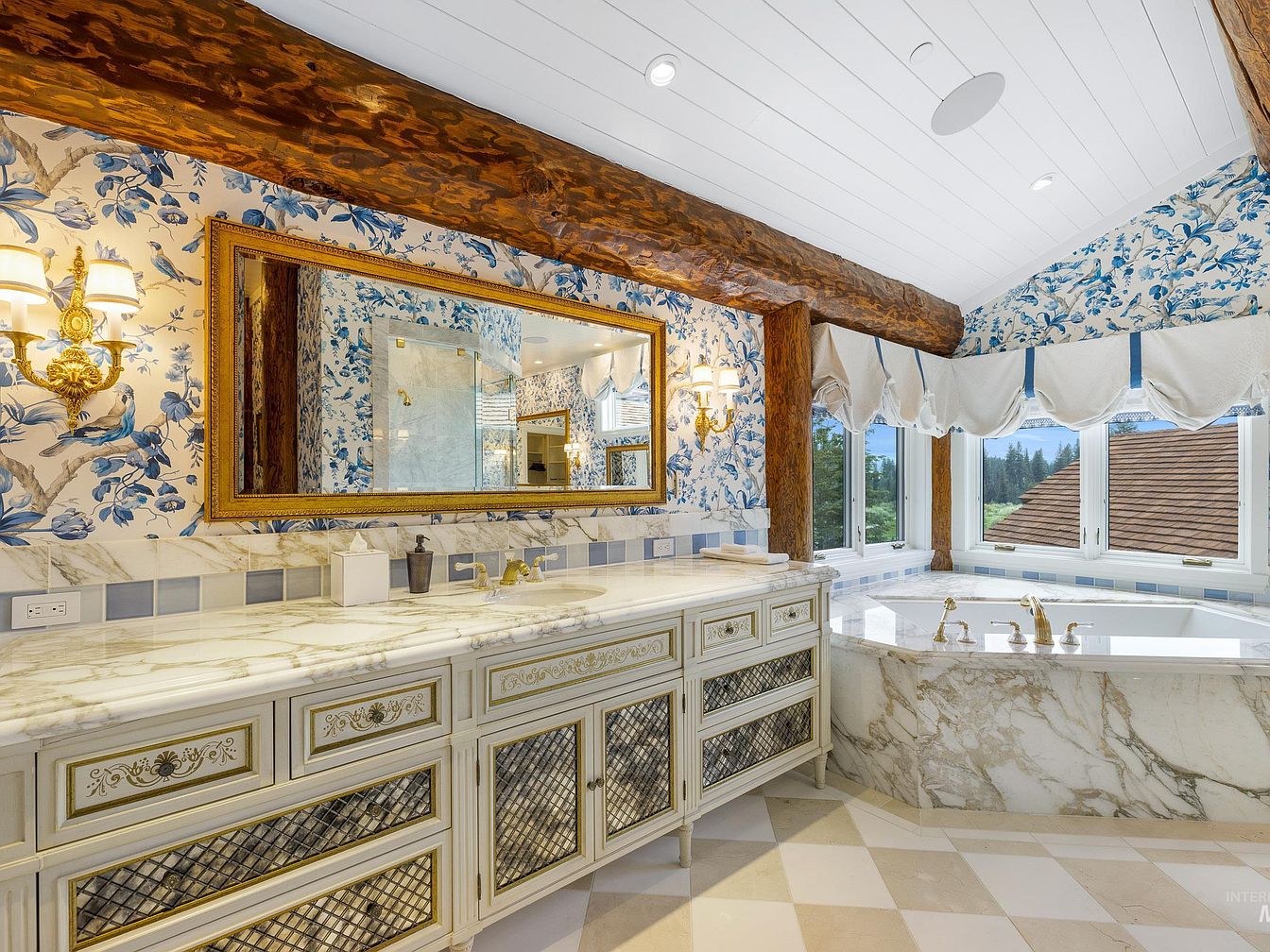 Bright and inviting, this primary bathroom boasts a spacious layout perfect for family use. The double vanity with ornate cabinetry and marble countertops offers ample storage and counter space. A deep soaking tub is beautifully set into a bay window nook, surrounded by elegant drapery and scenic natural views, making bath time special for all ages. Blue floral wallpaper and gold-framed accents add a charming, classic touch, complemented by rustic wood ceiling beams that bring warmth and character. Soft lighting from wall sconces and abundant sunshine complete the tranquil, luxurious ambiance of this cozy yet refined retreat.
