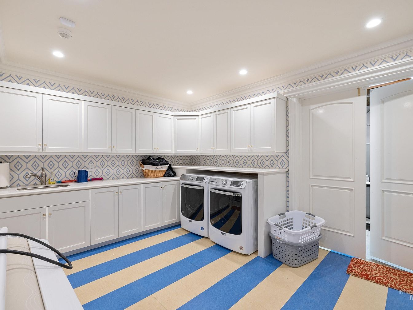 Bright, cheerful laundry room featuring ample white cabinetry for storing supplies and linens, offering a clutter-free and organized workspace. The patterned backsplash with soft blue and gray geometric motifs adds a modern, playful touch, making household chores feel less mundane. A pair of high-efficiency front-load washer and dryer units streamline laundry tasks, while a spacious countertop provides room for folding clothes. Bold, striped blue and beige flooring injects lively energy into the functional space, ideal for family use. Under-cabinet lighting and recessed ceiling lights create a warm, inviting ambiance, making it a welcoming spot for daily routines.