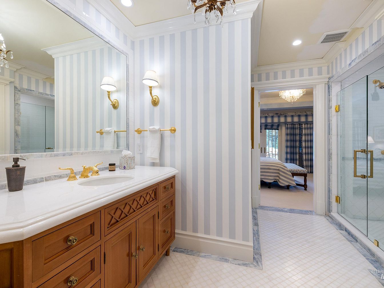 Elegant and spacious, this master bathroom exudes classic charm with its light blue and white vertical striped wallpaper and polished crown molding. The warm wooden vanity with intricate lattice detailing provides ample storage, complemented by a luxurious marble countertop and gold fixtures for a touch of sophistication. A large mirror and twin wall sconces enhance the space’s brightness, while a glass-enclosed shower adds modern functionality. The subtle, neutral floor tiles are easy to clean and ideal for family living. This bathroom seamlessly connects to the adjoining bedroom, blending style and convenience in a family-friendly layout perfect for busy mornings or relaxing evenings.