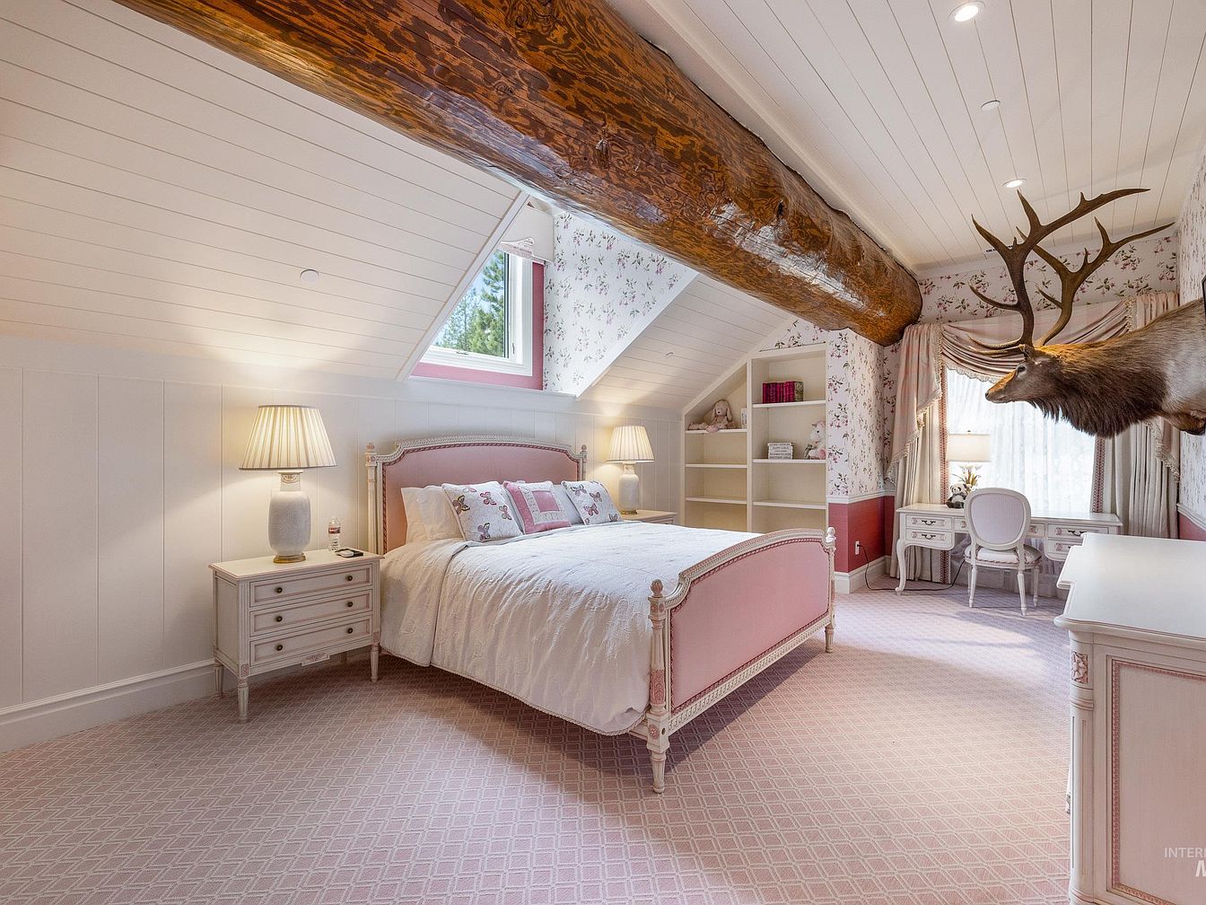 This attic bedroom features soft pastel tones, with blush pinks and whites dominating the color scheme, creating a soothing and family-friendly atmosphere. The sloped ceiling is adorned by an impressive exposed wood beam, adding a rustic yet elegant touch to the modern farmhouse decor. The floral wallpaper lends a gentle charm, complementing the plush pink carpeting and vintage-style furniture. Large windows bring in natural light, making the space feel airy and open. The room includes a desk and bookshelf, ideal for children or teens, and the spacious layout ensures plenty of room for relaxation and play.
