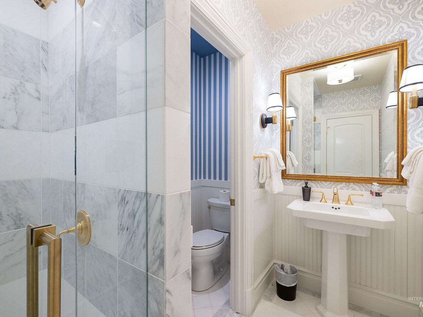 A well-designed bathroom featuring a classic white pedestal sink and gold hardware, complemented by a large, ornate framed mirror that adds a touch of elegance. The wall lights on either side of the mirror provide abundant illumination, making the space inviting for both adults and children. Soft patterned wallpaper in a neutral palette enhances the cozy atmosphere, while soft towels are neatly arranged for convenience. Marble tiles line the glass-enclosed shower, introducing a sense of luxury, and the adjoining water closet area is brightened by subtle blue and white striped walls. Durable materials and ample counter space make this bathroom suitable for everyday family needs.