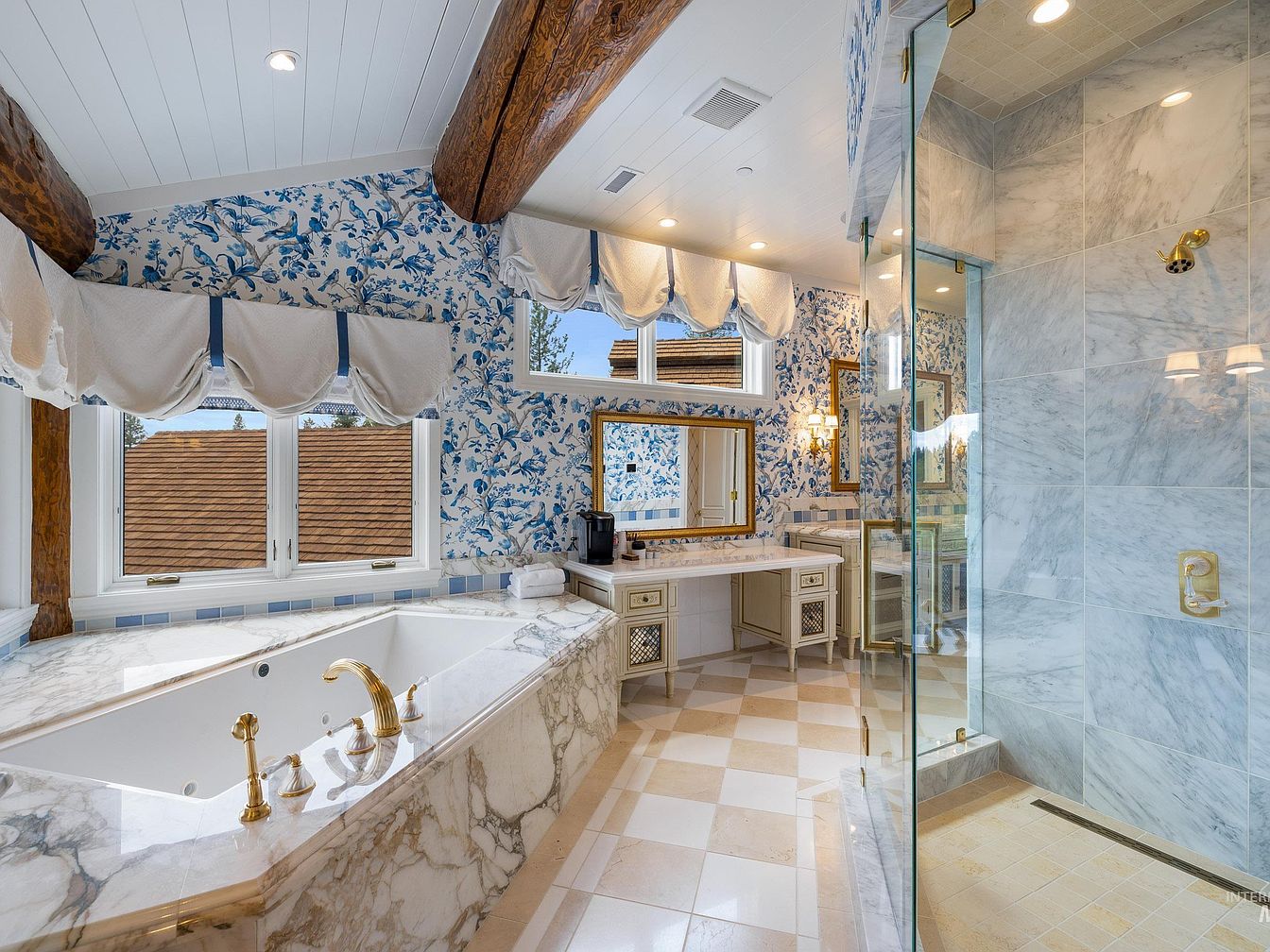 This bathroom embodies a harmonious blend of traditional charm and upscale comfort, offering a serene retreat for the family. A deep marble Jacuzzi tub takes center stage beneath large windows dressed in elegant, swagged curtains, creating a bright and welcoming atmosphere. Classic blue-and-white floral wallpaper adds a touch of whimsy while exposed rustic wood beams give warmth and character. The walk-in shower features expansive marble tiles and a sleek glass enclosure, paired with gold fixtures for added luxury. A generous double vanity with intricate cabinetry provides ample storage, making this an inviting, functional, and family-friendly space for relaxation.