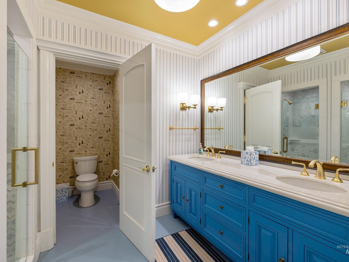 A bright and inviting bathroom features a spacious double vanity with vibrant blue cabinetry and sleek gold hardware, providing ample storage for family essentials. The long countertop offers twin sinks beneath a large framed mirror, ideal for busy morning routines. Warm wall sconces and recessed lighting enhance the cheerful ambiance, complemented by a bold yellow ceiling. A private water closet with charming illustrated wallpaper provides extra privacy, while a glass-enclosed shower adds a touch of modern luxury. Subtle striped wallpaper lends classic character, and the soft blue floors and a striped rug complete the fresh, personal, and family-friendly space.