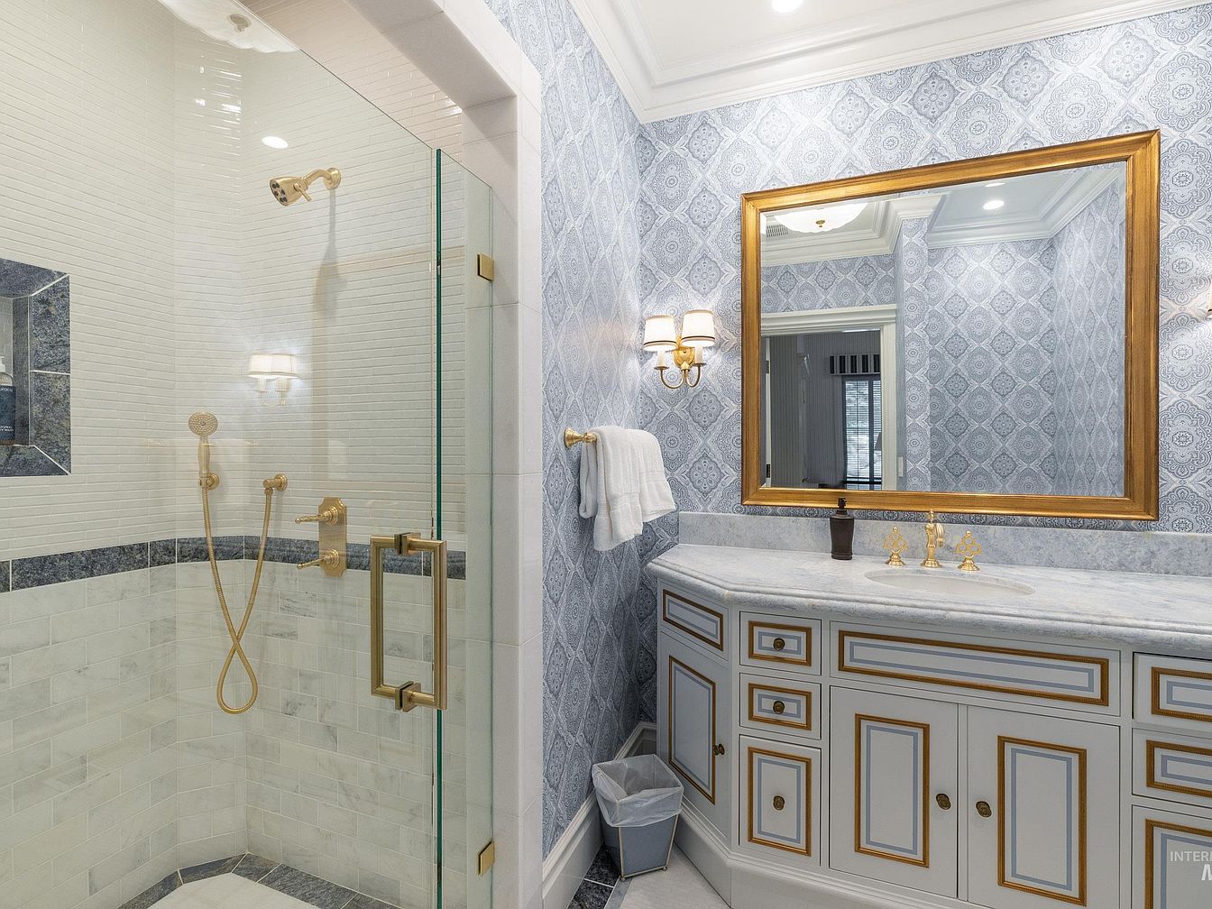 A sophisticated bathroom blends luxury with practicality, perfect for family living. The spacious glass-enclosed shower is adorned with gold fixtures and a convenient built-in shower bench, ideal for both relaxation and accessibility. The vanity stands out with its marble countertop, framed with gold accents matching the fixtures, providing ample storage for family essentials. Patterned blue wallpaper adds a touch of classic elegance, complemented by a large gold-framed mirror. Double sconce lighting flanks the mirror for warm, even illumination. The subtle palette of soft blues, white, and gold creates a serene, inviting atmosphere that suits adults and children alike.