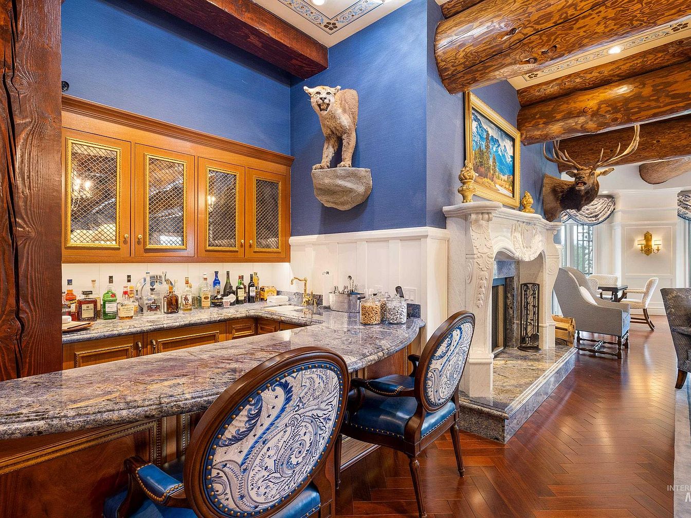 A luxurious home bar seamlessly blends rustic charm with sophisticated style, highlighted by exposed log beams and intricate ceiling details. Rich blue walls and elegant golden cabinetry set a vibrant scene, complemented by a polished stone countertop perfect for entertaining. Decorative chairs with ornate blue-and-white upholstery offer comfortable seating for gatherings. The family-friendly lounge area transitions to a cozy living space with a grand marble fireplace, artistic mantle, and mounted wildlife accents. Warm wood floors, soft accent lighting, and large windows create an inviting, open atmosphere suitable for leisurely evenings and social events alike.