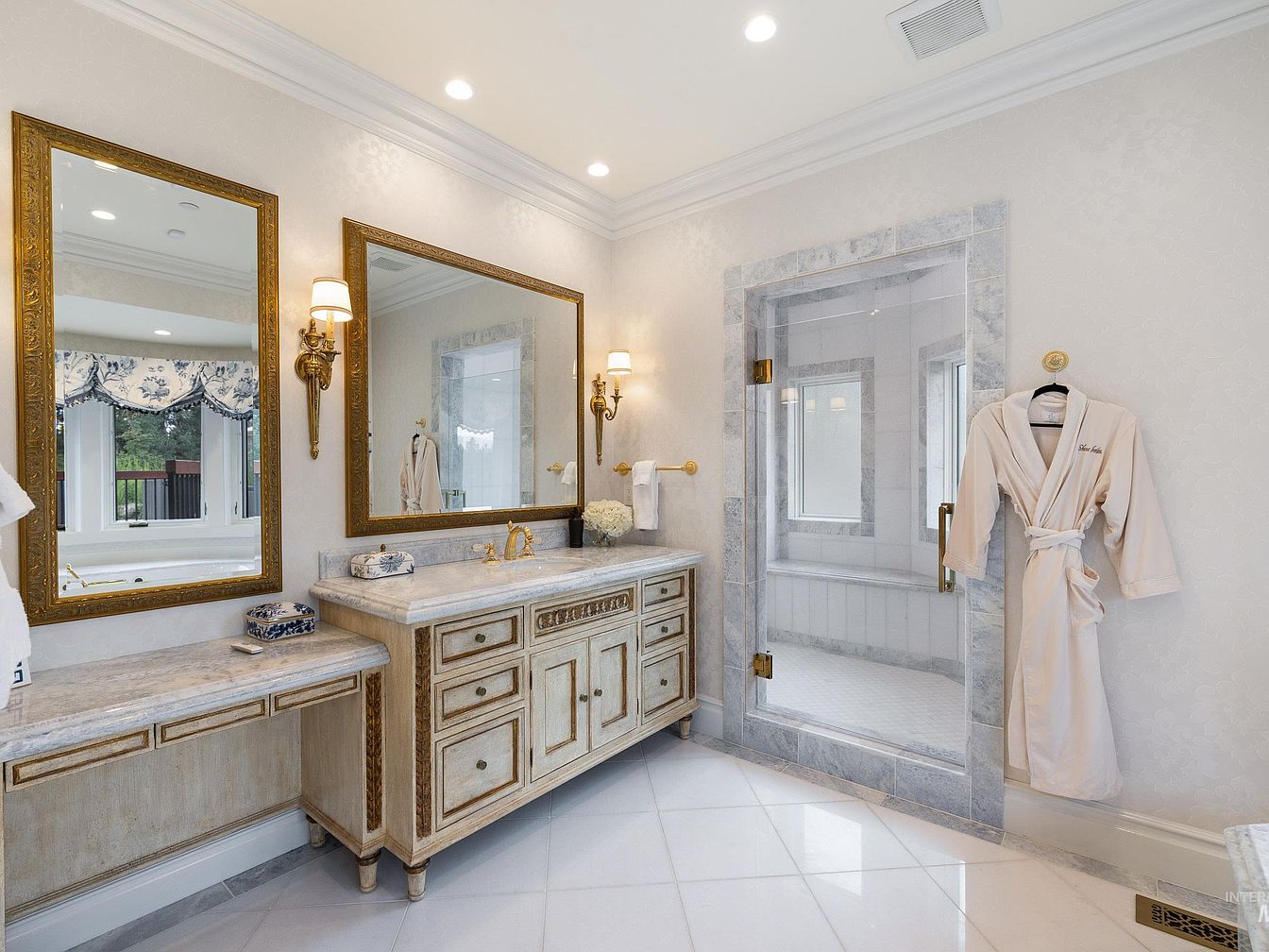 A spacious bathroom features elegant marble countertops, dual sinks, and vintage-inspired cabinetry for a sophisticated touch. Twin oversized mirrors with ornate gold frames are paired with classic wall sconces, creating a warm ambiance. The color palette is soft and neutral, dominated by creamy whites and muted golds, adding to the serene atmosphere. A glass-enclosed shower with marble trim sits beside a bench, making the space accessible and family-friendly. Built-in seating and ample storage offer both comfort and practicality. Thoughtful architectural details, such as crown molding and patterned wallpaper, complete the refined look, perfect for family routines or quiet relaxation.