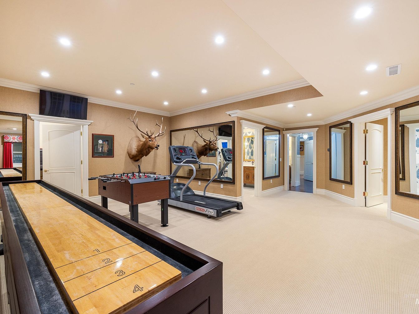 Spacious and welcoming, this game room blends entertainment and relaxation for all ages. The neutral beige walls and plush carpet create a warm, inviting atmosphere, while recessed lighting ensures the space feels bright and energetic. Family-friendly amenities include a shuffleboard table, foosball table, and treadmill, comfortably arranged for both play and fitness. Mounted elk heads and framed artwork add character, complementing the elegant architectural touches like crown molding and mirrored wall panels, which enhance the openness. Multiple access points lead to other sections of the home, and a wall-mounted TV offers additional entertainment, making it ideal for gatherings or family fun nights.