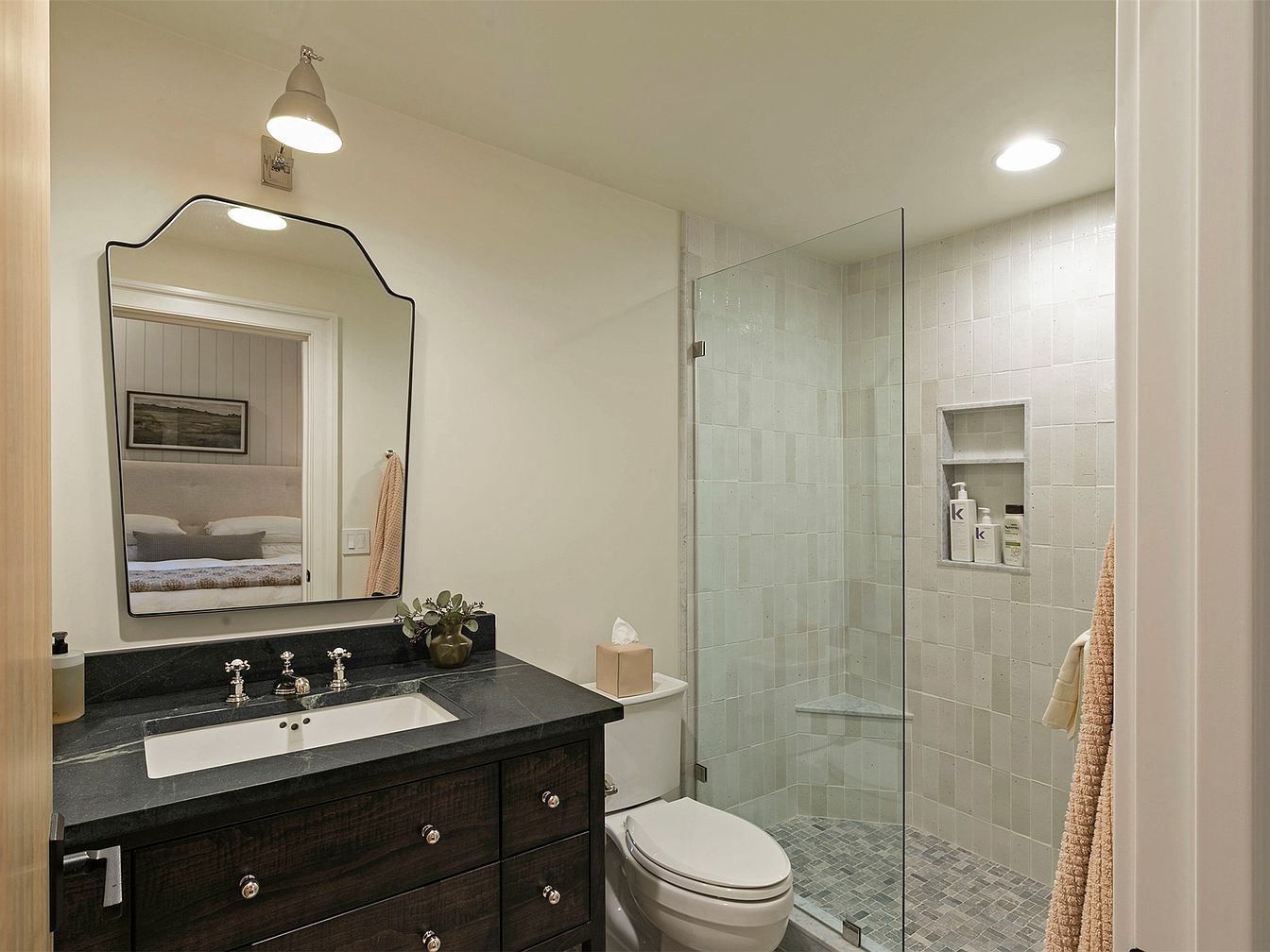 The sleek modern bathroom features a spacious layout, designed for efficiency and comfort. A striking black granite countertop pairs elegantly with dark cabinetry, enhancing the sophisticated aesthetic. The large, framed mirror adds depth, reflecting light and creating an airy atmosphere. A glass shower enclosure showcases minimalist tile work, fostering a serene spa-like experience. Family-friendly details include convenient shelving for toiletries and a blend of soft lighting, complemented by a warm color palette. This inviting space seamlessly combines practicality with stylish design, making it an ideal retreat for relaxation and everyday use.