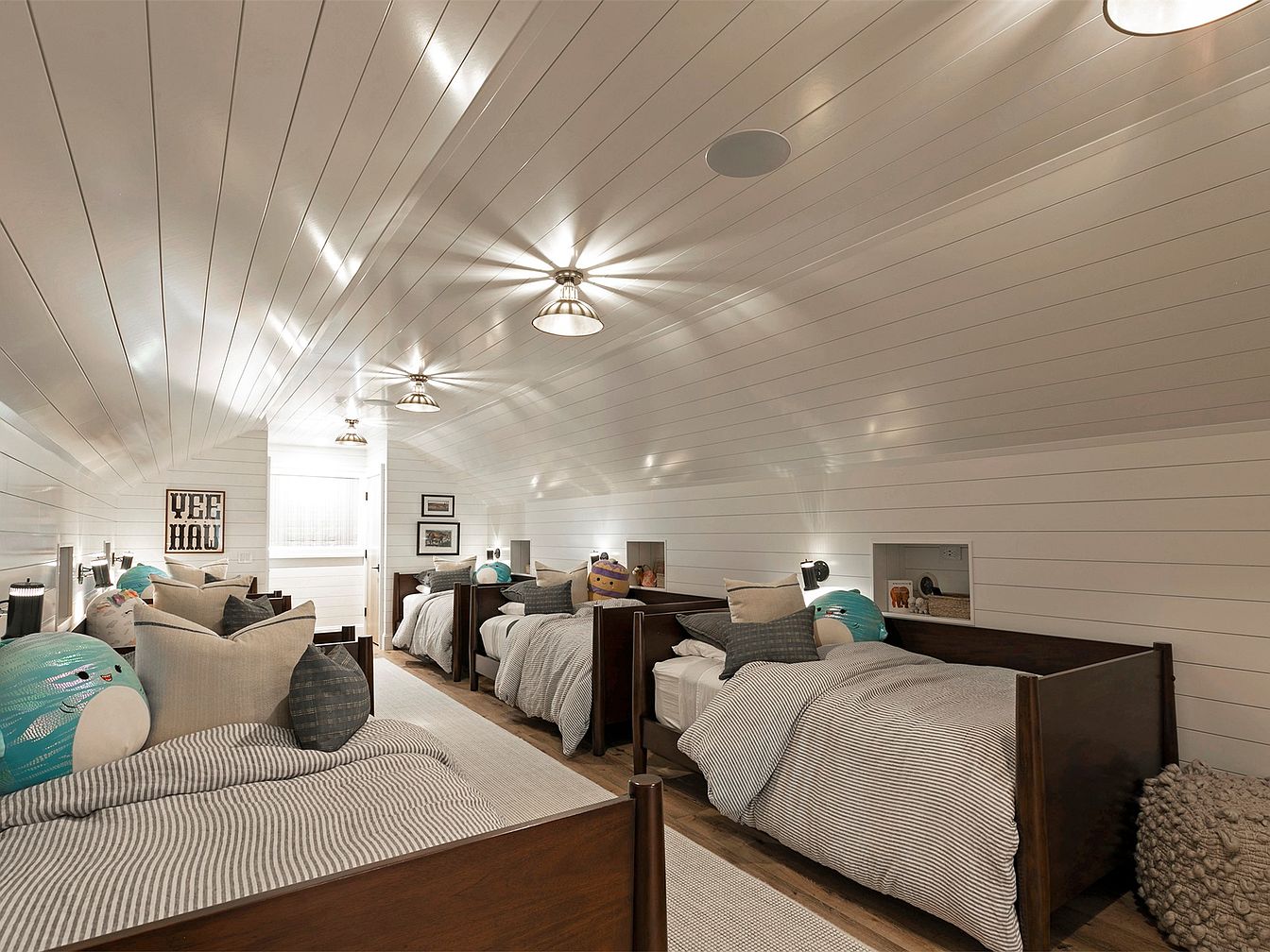This airy kids’ bedroom features a charming layout with multiple beds arranged smartly to maximize space and comfort. Each bed is crafted from rich wood, complemented by cozy striped bedding and an array of decorative pillows, adding playful color and texture. The soothing white shiplap walls and angled ceiling create a spacious yet inviting atmosphere, while pendant lighting provides a warm glow. Thoughtfully designed with family-friendly elements, such as easy-clean surfaces and built-in cubbies, this room promotes both relaxation and fun. Perfect for sleepovers, it radiates warmth and whimsy, capturing the essence of childhood delight.