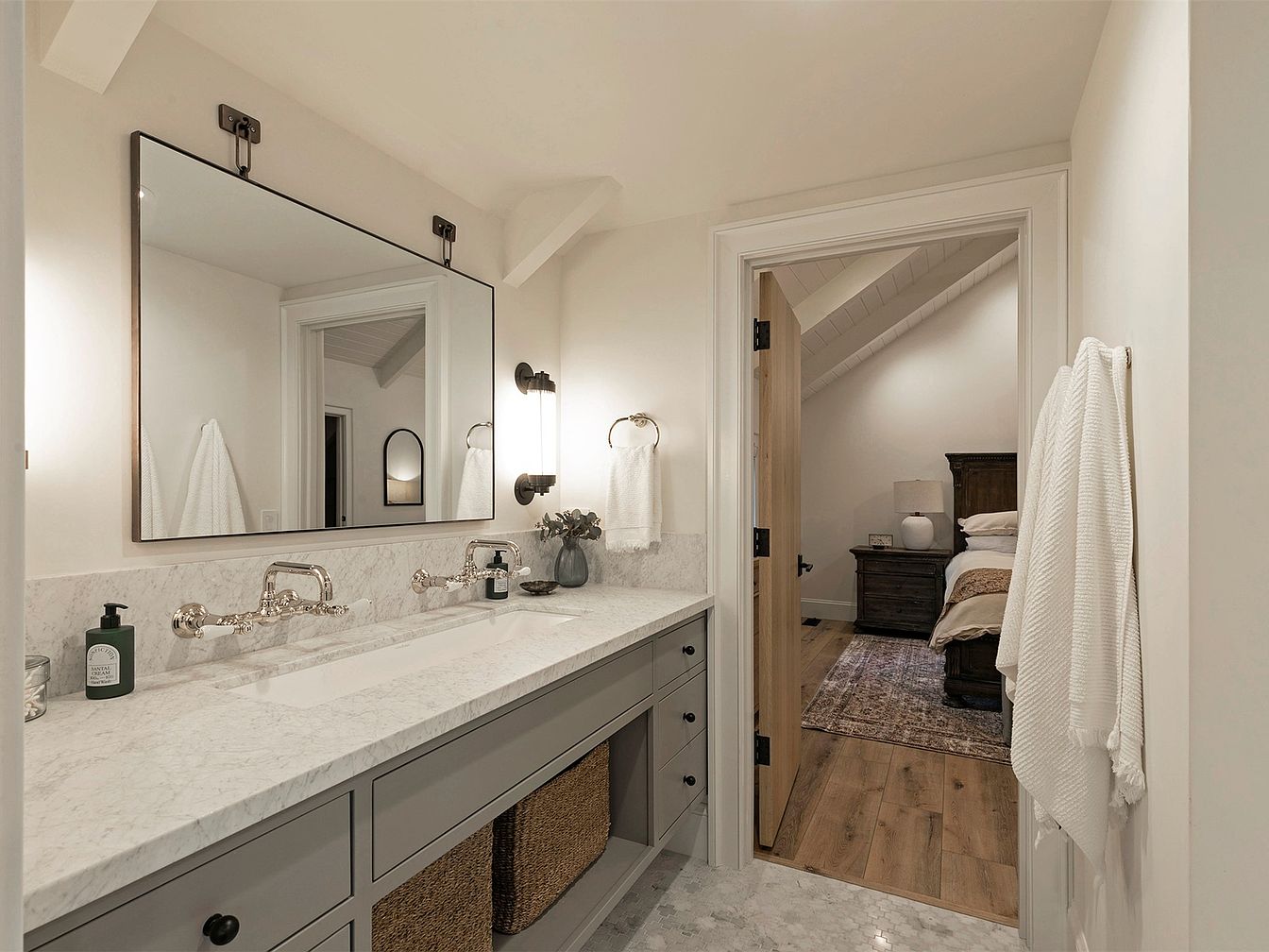 This inviting bathroom features a spacious double vanity with a striking marble countertop, complemented by sleek chrome fixtures. The warm color scheme of soft whites and greys creates a calming atmosphere. Underneath the vanity, stylish woven baskets offer practical storage, keeping essentials neatly tucked away. Two modern wall sconces flank the large mirror, providing both illumination and a touch of elegance. The room showcases beautiful architectural details, including sloped ceilings and polished wooden flooring, enhancing its cozy ambiance. A doorway leads seamlessly into a tranquil bedroom, making this bathroom an ideal family-friendly space that combines functionality with sophistication.