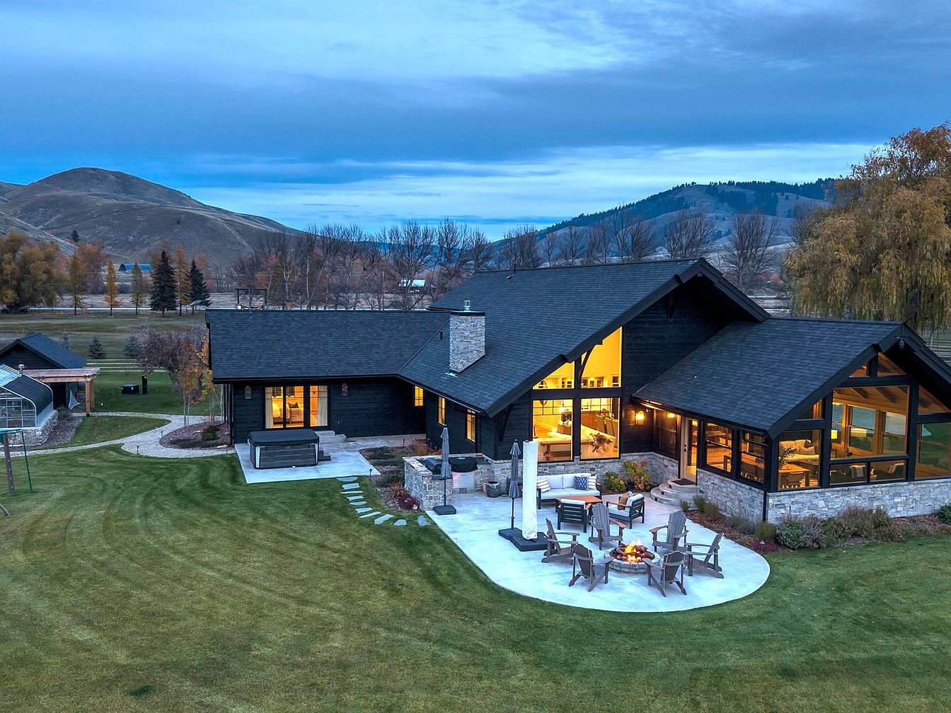 This stunning American home offers a picturesque backyard retreat, showcasing a blend of modern design and natural beauty. The expansive patio, complete with a cozy fire pit and comfortable seating, invites family gatherings or quiet evenings under the stars. The home’s facade features dark wood and stone accents, creating a warm yet contemporary atmosphere. Large windows flood the interior with light while providing spectacular views of the surrounding landscape. A lush lawn and well-maintained garden add to the charm, making this space ideal for children to play and adults to relax, all set against a breathtaking mountain backdrop.