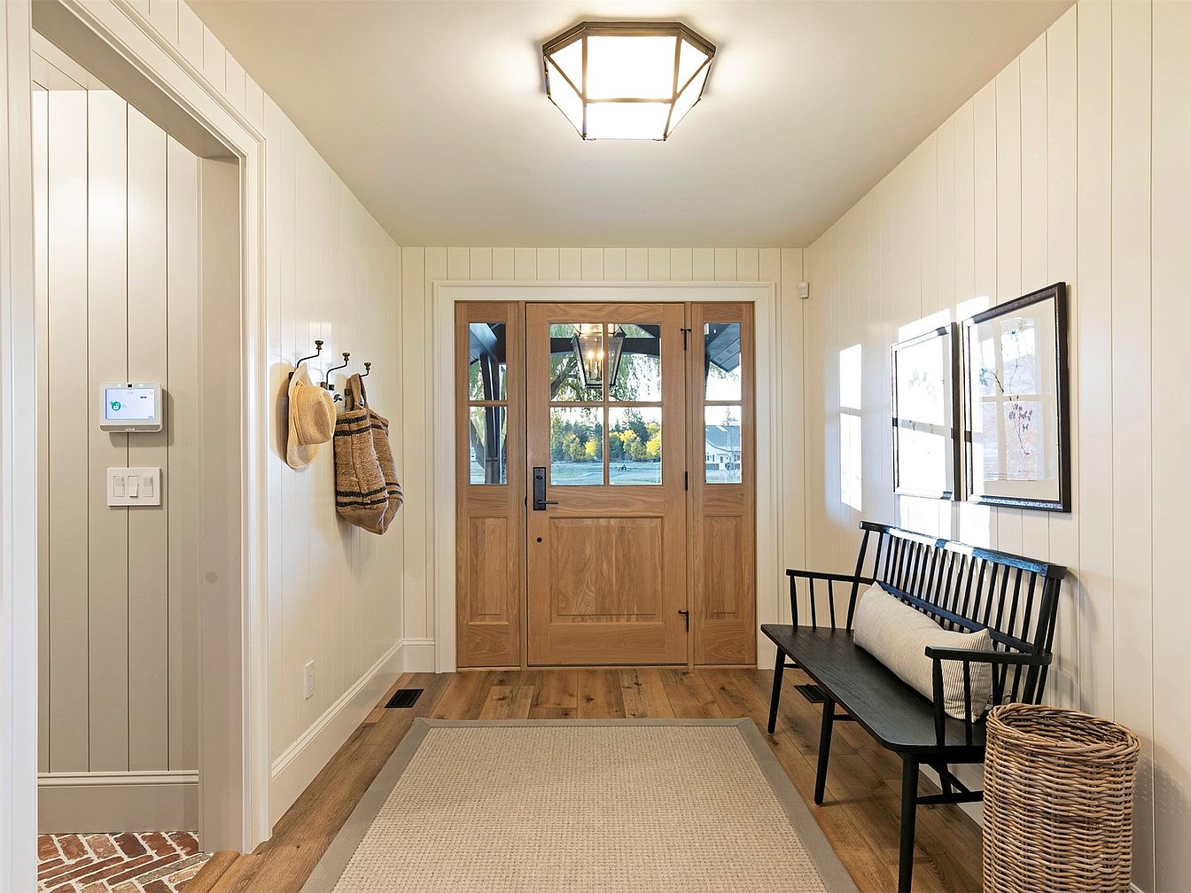 This inviting entryway boasts a blend of modern comfort and rustic charm, featuring shiplap walls in soft white tones that enhance the natural light flooding in through large windows. The rich wood front door, accented with black hardware, introduces a warm, welcoming aesthetic. A black wooden bench provides a cozy spot for guests, paired with textured pillows for added comfort. Functional wall hooks offer practical storage for hats and bags, while a woven basket adds an organic touch. Rich hardwood floors unite both elegance and durability, making this space perfect for family life and entertaining.