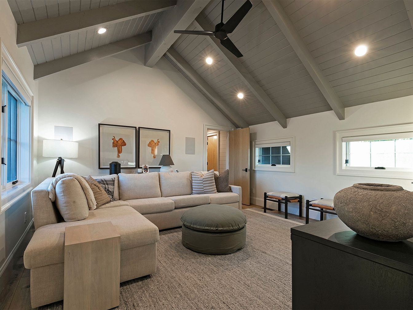 This inviting living room features an open layout with soaring vaulted ceilings that create a spacious yet intimate atmosphere. The neutral color palette, dominated by soft whites and earthy tones, is complemented by the textured beige sectional couch, which encourages family gatherings. Decorative accents such as throw pillows add a touch of warmth. A stylish ceiling fan enhances airflow, while ample natural light filters through the windows, illuminating the elegant wood accents. The subtle artwork on the walls and the tasteful décor create a sophisticated yet homey feel, making it perfect for relaxation and family bonding.