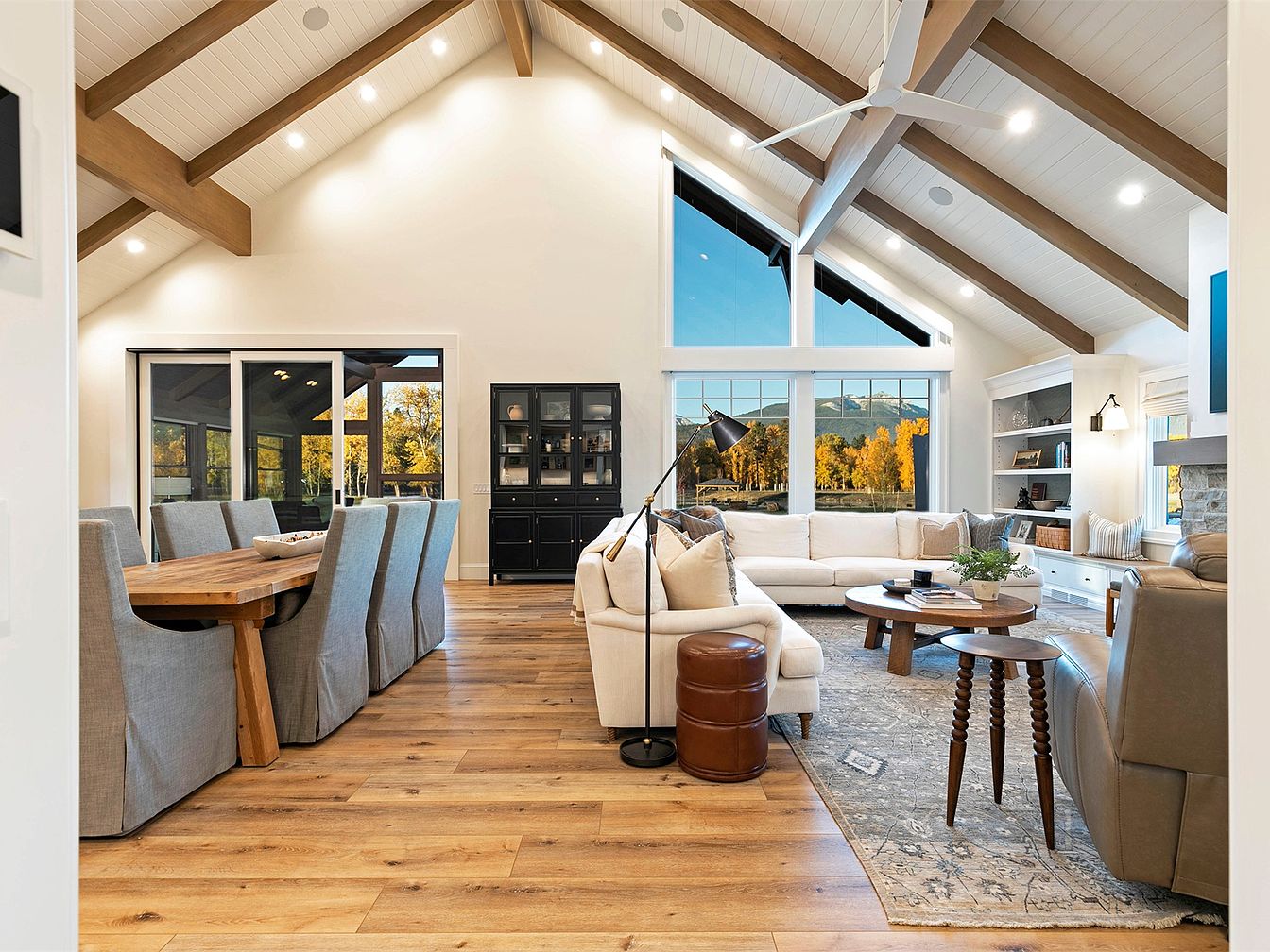 This spacious open-concept living area seamlessly blends comfort and style, perfect for family gatherings. The soaring vaulted ceilings, accented with wooden beams, create an airy ambiance, enhanced by natural light streaming through expansive windows. The color palette features warm neutral tones, complemented by plush seating in soft fabrics. A rustic wooden dining table invites shared meals, while the cozy seating arrangement includes a chic sectional and modern armchairs. Architectural details like recessed lighting and a stone fireplace provide warmth and elegance. The layout encourages connection, making it an ideal family-friendly space for relaxation and entertaining.