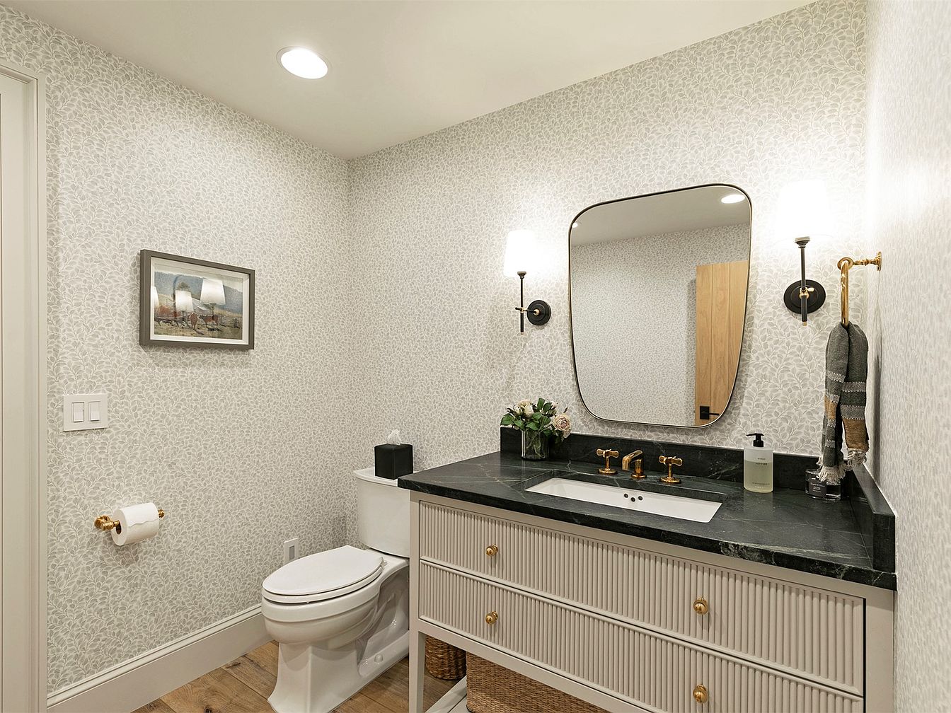 This stunning bathroom features a seamless blend of modern elegance and functionality. The dark green marble countertop contrasts beautifully with the light, textured wallpaper adorned with delicate floral patterns. Sleek, gold fixtures add a touch of luxury, while strategically placed sconces provide warm illumination. The spacious design includes a stylish floor-mounted toilet and ample storage with a ribbed cabinetry below. A distinct framed art piece enhances the inviting atmosphere, perfect for relaxation. This family-friendly space is both practical and aesthetically pleasing, showcasing thoughtful architectural details that elevate everyday essentials into a delightful experience.