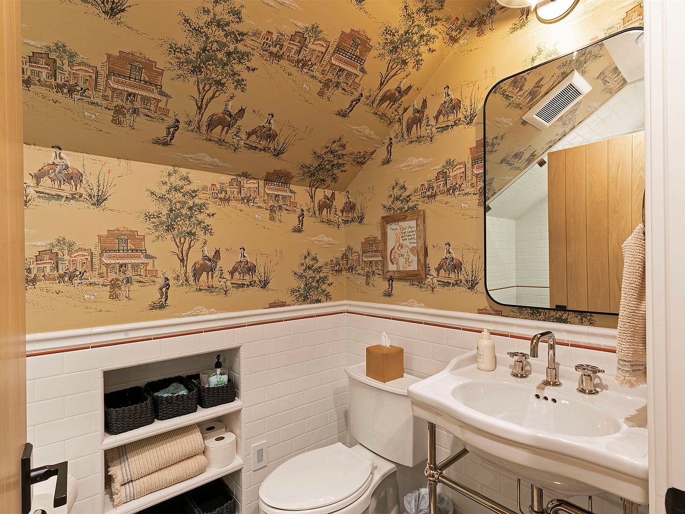 This powder room exudes a unique Americana charm, showcased through its vintage Western-themed wallpaper featuring picturesque scenes of cowboys, horses, and rugged landscapes. The warm beige tones of the wallpaper are complemented by crisp white tiling and subtle red accents along the base, creating a cozy yet stylish atmosphere. The sleek, oval mirror enhances the space, reflecting natural light and making the room feel more open. Practical features include ample storage with built-in shelving housing stylish baskets, and an elegant sink with classic faucet fixtures, ensuring both functionality and comfort for family and guests.