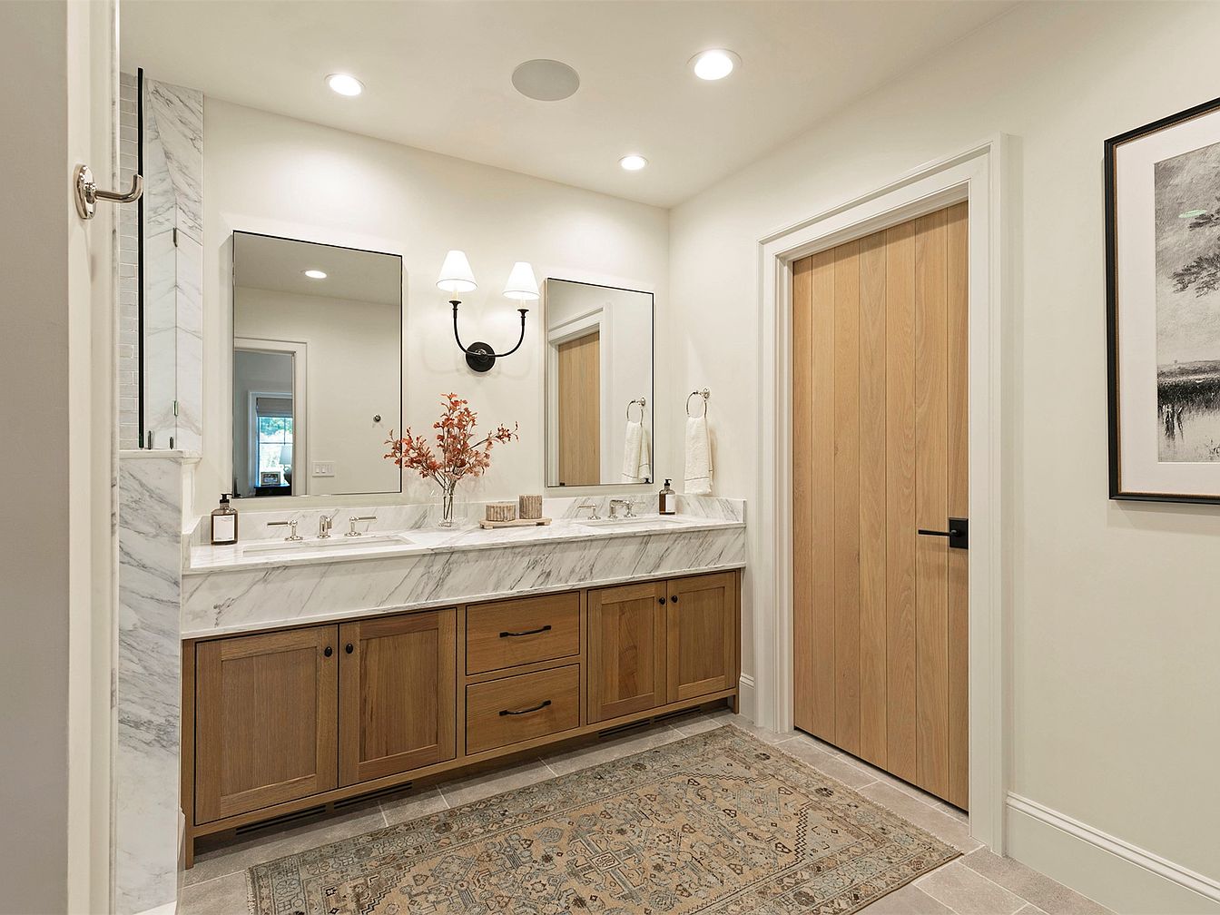 This spacious bathroom features a harmonious blend of modern elegance and warm textures. A wide vanity with rich wooden cabinetry complements the sleek marble countertop, creating a sophisticated focal point. Dual mirrors above the sink reflect the ample light from stylish sconces, enhancing the welcoming atmosphere. The neutral color palette, with soft whites and light grays, promotes a serene environment, ideal for relaxation. Family-friendly touches, like the practical yet stylish storage, ensure a clutter-free space. The delicate area rug adds a cozy element, while the natural light streaming through the door creates a bright and airy experience.