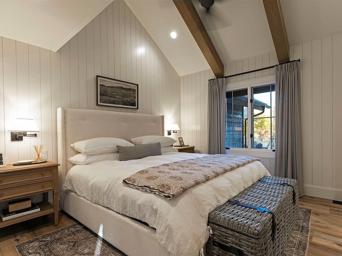 This master bedroom blends comfort with a contemporary aesthetic, showcasing a vaulted ceiling adorned with exposed wooden beams. Soft, muted tones dominate the space, creating a serene atmosphere. The plush upholstered headboard pairs beautifully with crisp white bedding, inviting relaxation. Nightstands with elegant lamps flank the bed, providing both functionality and style. A subtle area rug anchors the room, while tasteful artwork enhances the walls. Natural light floods in through the large window, complementing the airy feel. Additionally, woven storage baskets at the foot of the bed offer practical, stylish organization, ideal for a family-friendly environment.