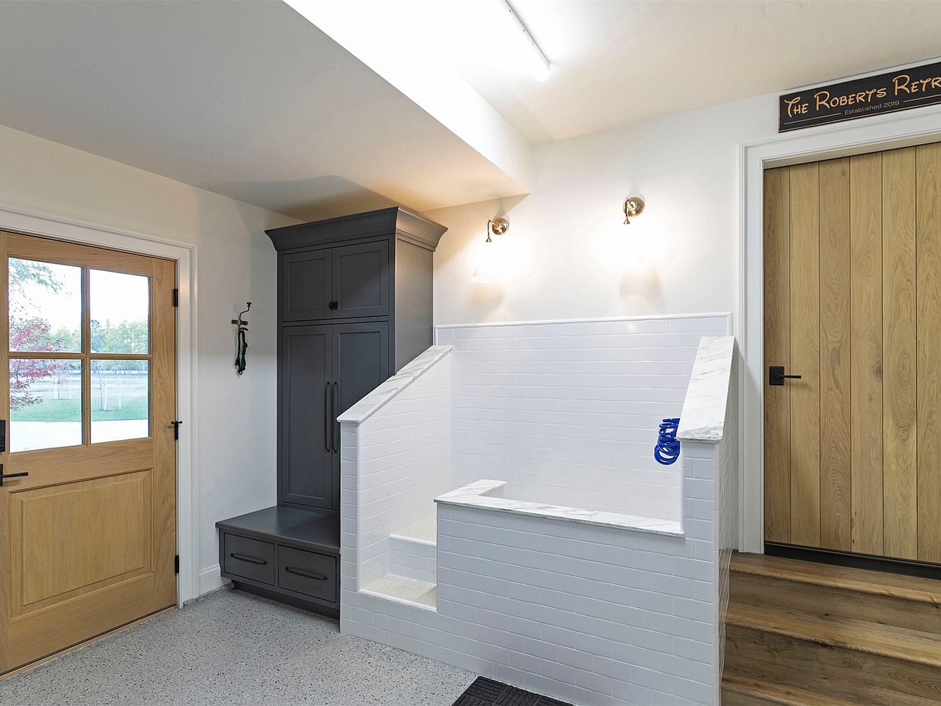 This welcoming entryway features a functional layout with a spacious feel, ideal for busy families. It showcases a blend of modern and traditional elements, highlighted by a warm wooden door adorned with glass panes. The dark cabinetry offers ample storage, while the white subway tile creates a fresh, clean look. The stylish staircase transitions seamlessly to the upper level, complemented by elegant marble accents. Soft lighting fixtures enhance the ambiance, and the rich wood flooring adds warmth, creating an inviting atmosphere. The overall color palette combines neutrals with warm tones, ensuring a cozy yet stylish entry.