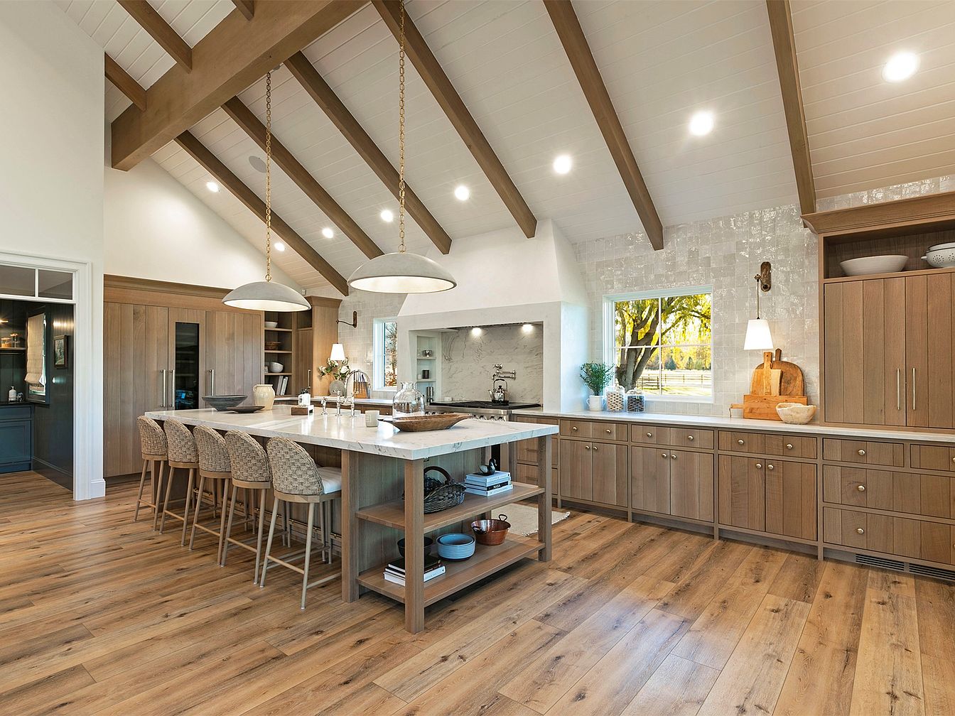 This modern kitchen features an open layout illuminated by natural light pouring in from large windows, enhancing the airy atmosphere. The vaulted ceiling with exposed wooden beams adds a rustic charm, complementing the warm wood cabinetry and sleek countertops. A central island promotes family gatherings and casual dining, furnished with stylish bar stools. The color scheme blends soft neutrals with earthy tones, creating a calming environment. Thoughtful design elements, such as decorative tiles and functional shelving, marry aesthetics with practicality, making this space ideal for cooking and entertaining while maintaining a welcoming, family-friendly vibe.