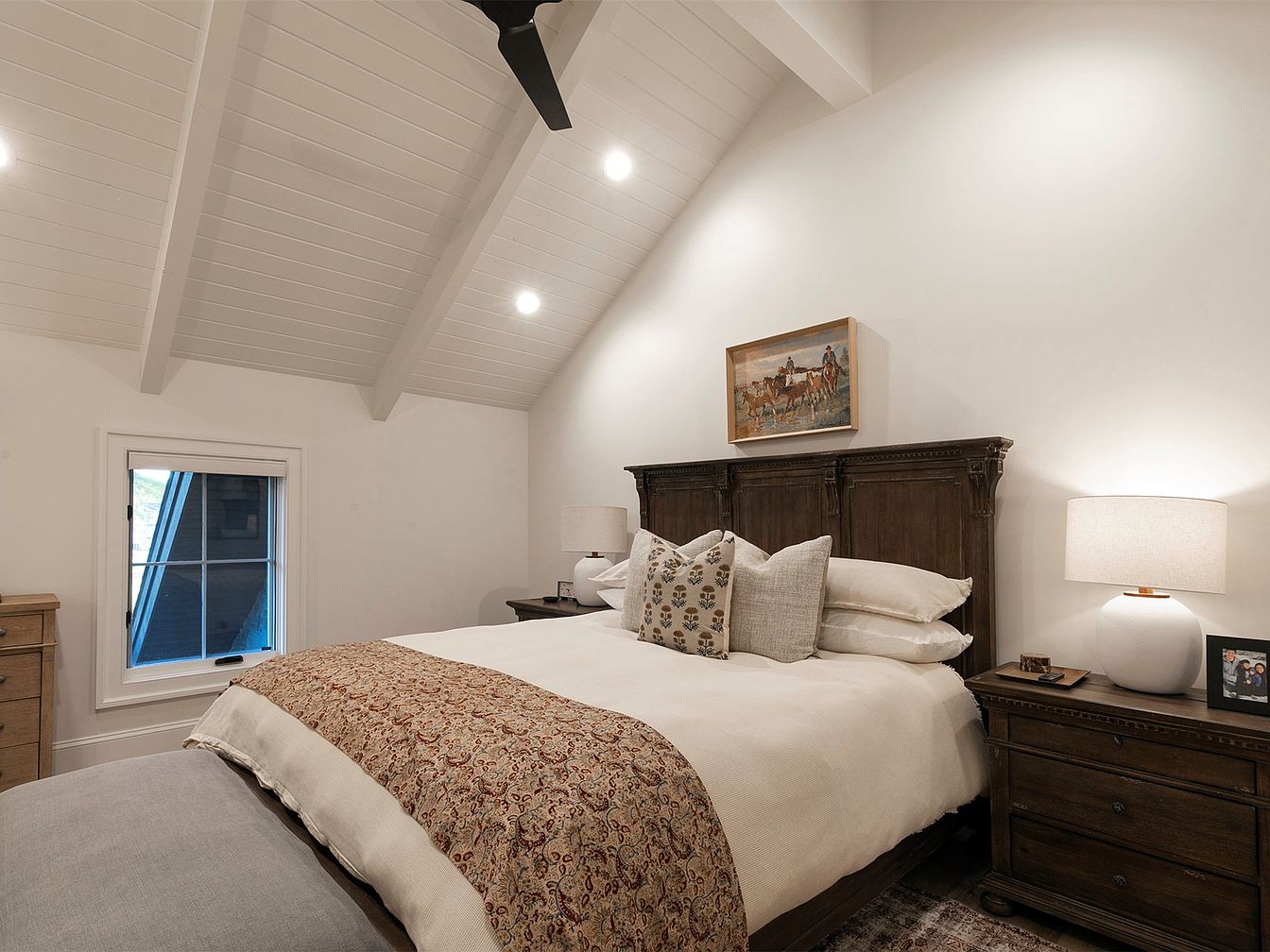 This master bedroom showcases vaulted ceilings with exposed beams, creating an airy and spacious atmosphere. The neutral color palette of soft whites and warm browns enhances its calming ambiance. A plush bed, adorned with decorative pillows and a richly patterned blanket, serves as a centerpiece, inviting relaxation. The wooden nightstands, harmonizing with the rustic charm, are paired with tasteful lamps that emit soft light. A cozy rug underfoot adds texture, while the window, framed by white trim, allows natural light to fill the space. Artwork on the wall reflects a cozy, equestrian theme, completing the inviting aesthetic.