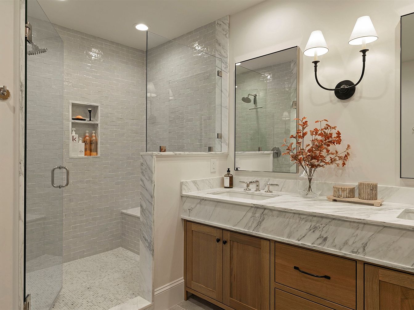 A sleek and modern bathroom features a spacious glass shower enclosed by elegant gray tile, creating a serene retreat. The dual vanity boasts a stunning white marble countertop, complemented by warm wooden cabinetry that adds a touch of natural warmth. Stylish sconces provide soft lighting, enhancing the room’s soothing atmosphere. A decorative vase with autumn-hued branches introduces a splash of color, merging style with nature. The minimalist approach extends to the large mirrors, reflecting light and making the space appear larger. Thoughtfully designed for family use, this sanctuary perfectly balances luxury with functionality, ideal for everyday living.