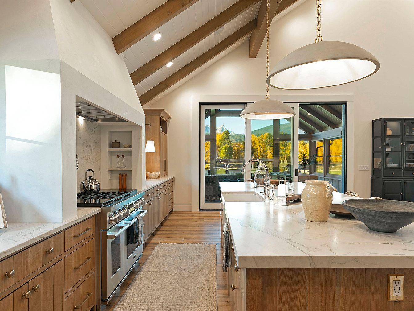 This contemporary kitchen features an open layout, showcasing sleek marble countertops and warm wooden cabinetry that create a harmonious balance of elegance and comfort. The high ceilings accentuated by exposed beams foster an airy atmosphere, while large windows flood the space with natural light, offering picturesque views of surrounding nature. Family-friendly elements include a spacious island, perfect for gatherings or casual dining, complemented by functional appliances, including a standout range. The neutral color palette is punctuated by soft lighting fixtures, enhancing the kitchen’s welcoming ambiance, making it an ideal setting for both culinary creativity and family memories.