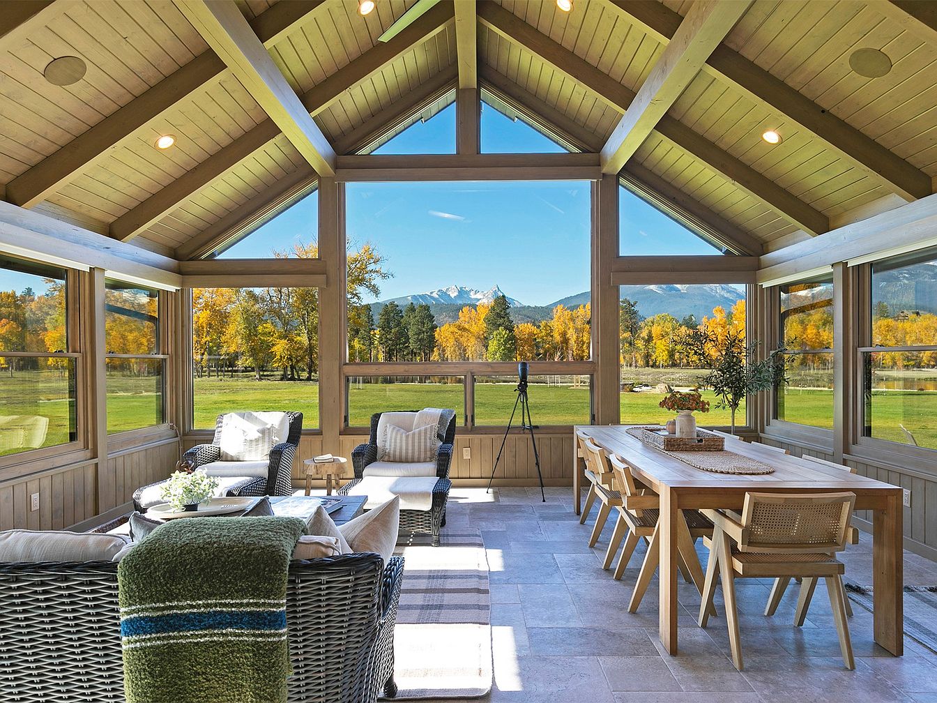 This inviting sunroom features a stunning open layout with soaring vaulted ceilings that enhance the natural light flooding in through expansive windows. Cozy seating areas, adorned with plush cushions, create a perfect spot for relaxation, while a long wooden dining table invites family gatherings. The warm, earthy color palette reflects the surrounding autumn foliage, fostering a sense of connection with nature. Architectural details like exposed beams and soft, neutral tones add to its charm. This space is designed for family-friendly living, ideally blending comfort and style while providing breathtaking views of the mountains and rolling landscapes.