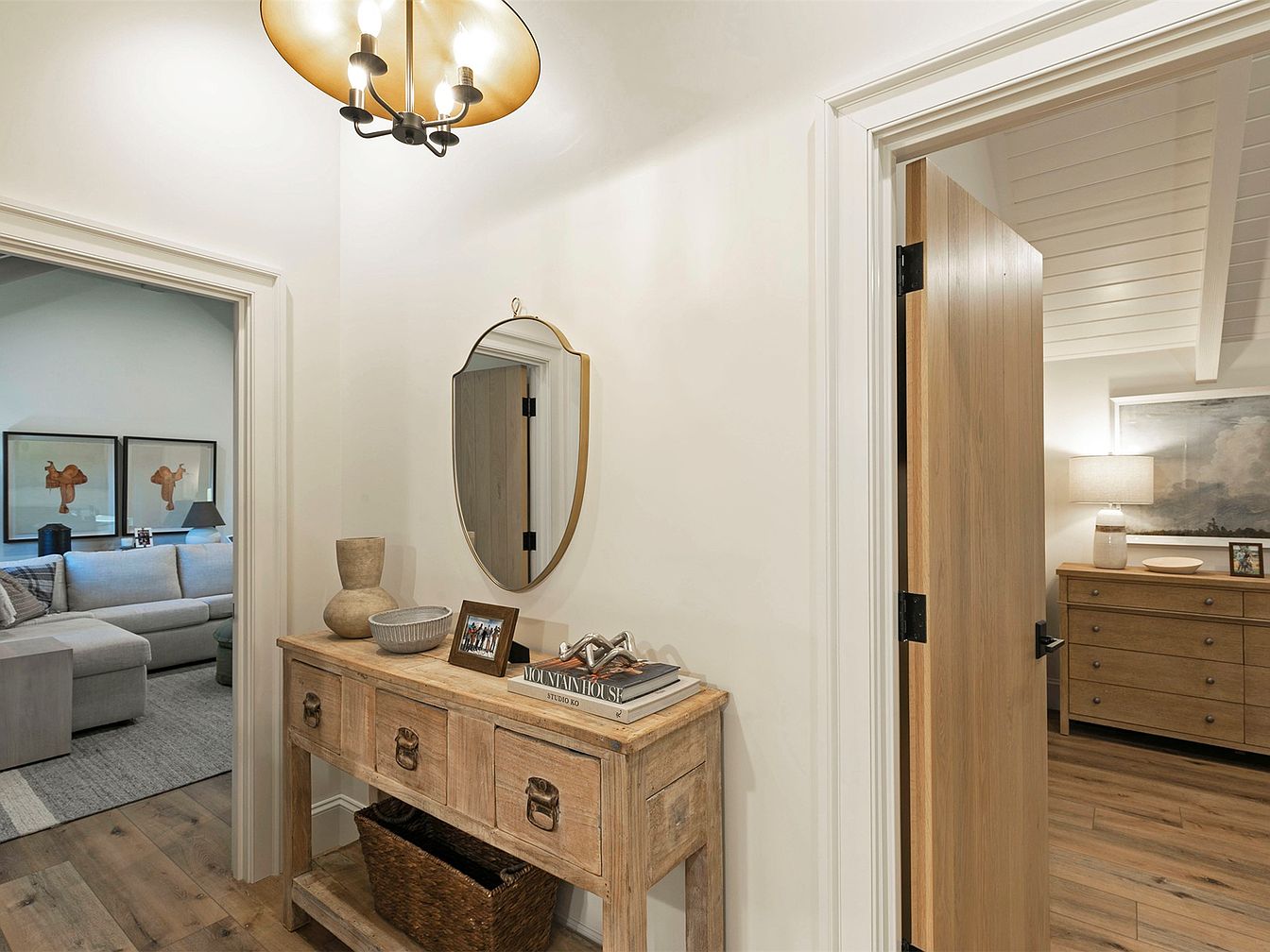 This inviting entryway features a blend of contemporary and rustic aesthetics, creating a warm welcome. The textured wooden console table adds character, while a decorative mirror reflects light, enhancing the space’s brightness. Subtle earthy tones dominate the color scheme, complemented by natural wood finishes and a stylish pendant light. Family-friendly features like ample storage and a cozy nook for personal touches showcase practicality. A glimpse into the living area reveals a comfortable sofa and tasteful artwork, promising relaxation and connection. This thoughtfully designed space seamlessly transitions from function to style, perfect for modern family living.