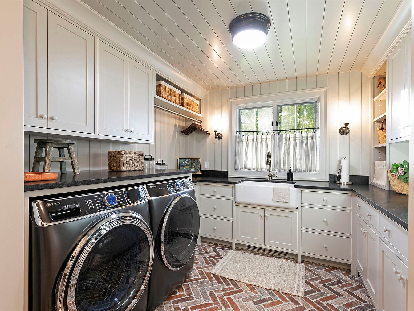 This well-designed laundry room presents a harmonious blend of functionality and style. The rich, textured brick flooring complements the sleek, dark countertops, creating a warm and inviting atmosphere. Here, modern washer and dryer units sit seamlessly integrated into the cabinetry, which features crisp white finishings and ample storage space above. Natural light filters in through the window adorned with delicate sheer curtains, enhancing the overall brightness. Thoughtfully placed lighting fixtures provide additional illumination, while open shelving and wicker baskets add a touch of rustic charm, making this laundry space not just practical, but also a pleasing part of the home.