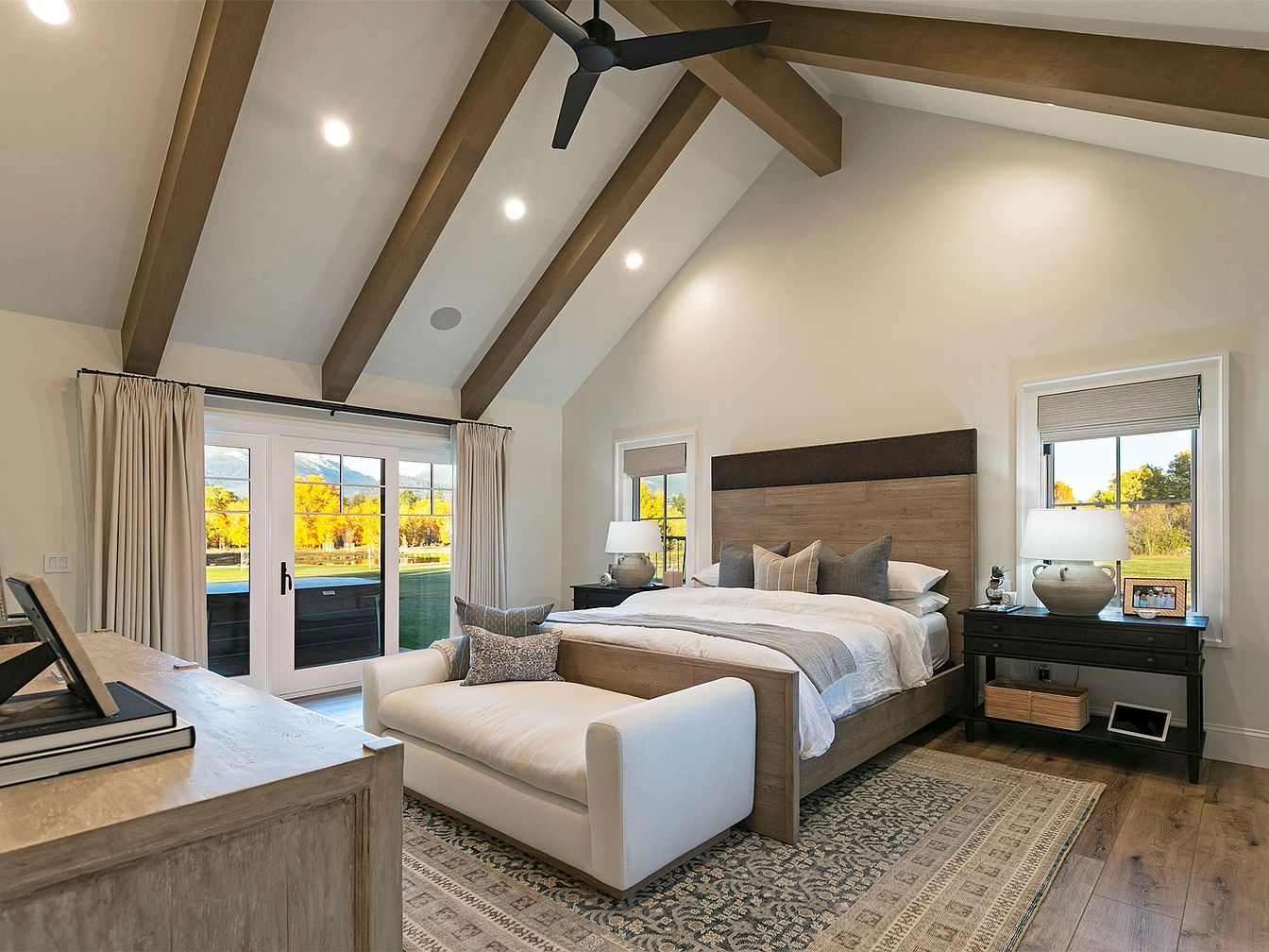 This master bedroom showcases a harmonious blend of modern comfort and rustic charm. The spacious layout features soaring vaulted ceilings adorned with reclaimed wood beams, enhancing the airy feel. A plush king-sized bed takes center stage, fitted with layered bedding and decorative pillows that invite relaxation. Neutral tones dominate the color scheme, complemented by warm wood accents and rich textures in the furniture. Large windows provide stunning views of the outdoor landscape and flood the room with natural light, while soft drapes frame the windows for added elegance. An inviting chaise lounge adds a thoughtful touch, perfect for quiet moments.