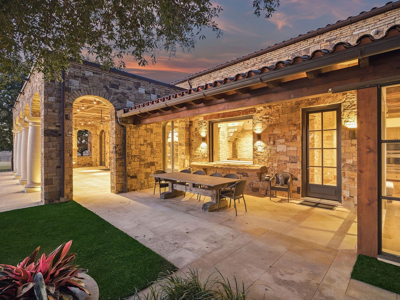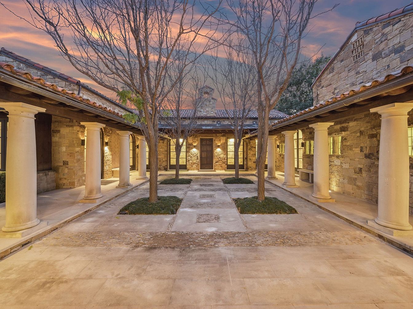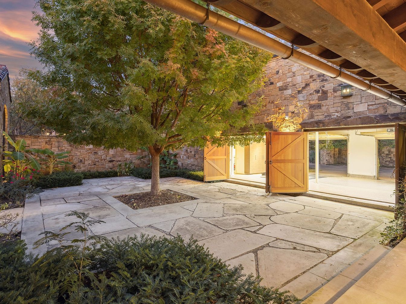 A stunning courtyard entrance welcomes you with its harmonious blend of natural stone and elegant architecture. Flanked by sturdy columns, the pathway is paved with smooth stone and bordered by lush greenery, providing a relaxing atmosphere. The warm glow of integrated lighting softly illuminates the space, enhancing the welcoming ambiance as the sun sets. Mature trees add a touch of nature while maintaining open sight lines, perfect for family gatherings or quiet moments. The terracotta tiled roof contrasts beautifully with stone walls, showcasing a timeless design that invites both elegance and comfort in outdoor living.