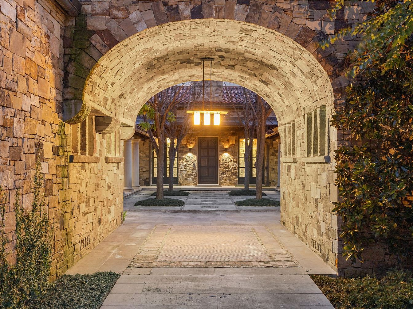 This charming entryway showcases a stunning arched stone passage adorned with intricate masonry, leading to a beautifully landscaped courtyard. The warm glow of hanging lanterns invites guests, illuminating the textured stone walls that blend rustic elegance with modern comfort. A meticulously paved pathway directs attention to the main entrance, framed by vibrant greenery and subtle landscaping that enhances the inviting atmosphere. Exposed beams and a terracotta roof complement the natural materials, creating a cohesive look that reflects craftsmanship. Family-friendly features, such as ample space for children to play or relax, ensure that this entryway is both practical and visually appealing.