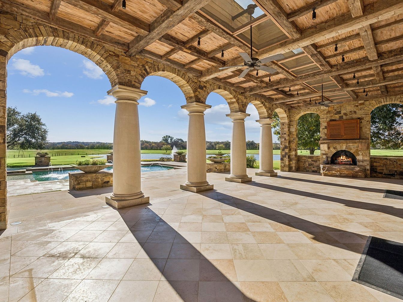 This stunning outdoor living space seamlessly blends luxury and comfort, featuring tall stone arches that invite natural light and scenic views. Prominent, sturdy columns frame the area, enhancing the architectural appeal while providing a sense of grandeur. The ceiling showcases intricately detailed wooden beams, adding warmth and texture. Abundant space offers flexibility for gatherings, making it perfect for family activities or quiet retreats. A built-in stone fireplace adds a cozy touch, ideal for cooler evenings. Pale, neutral tiles reflect sunlight, harmonizing with the lush greenery beyond, ensuring a serene and inviting atmosphere for relaxation.