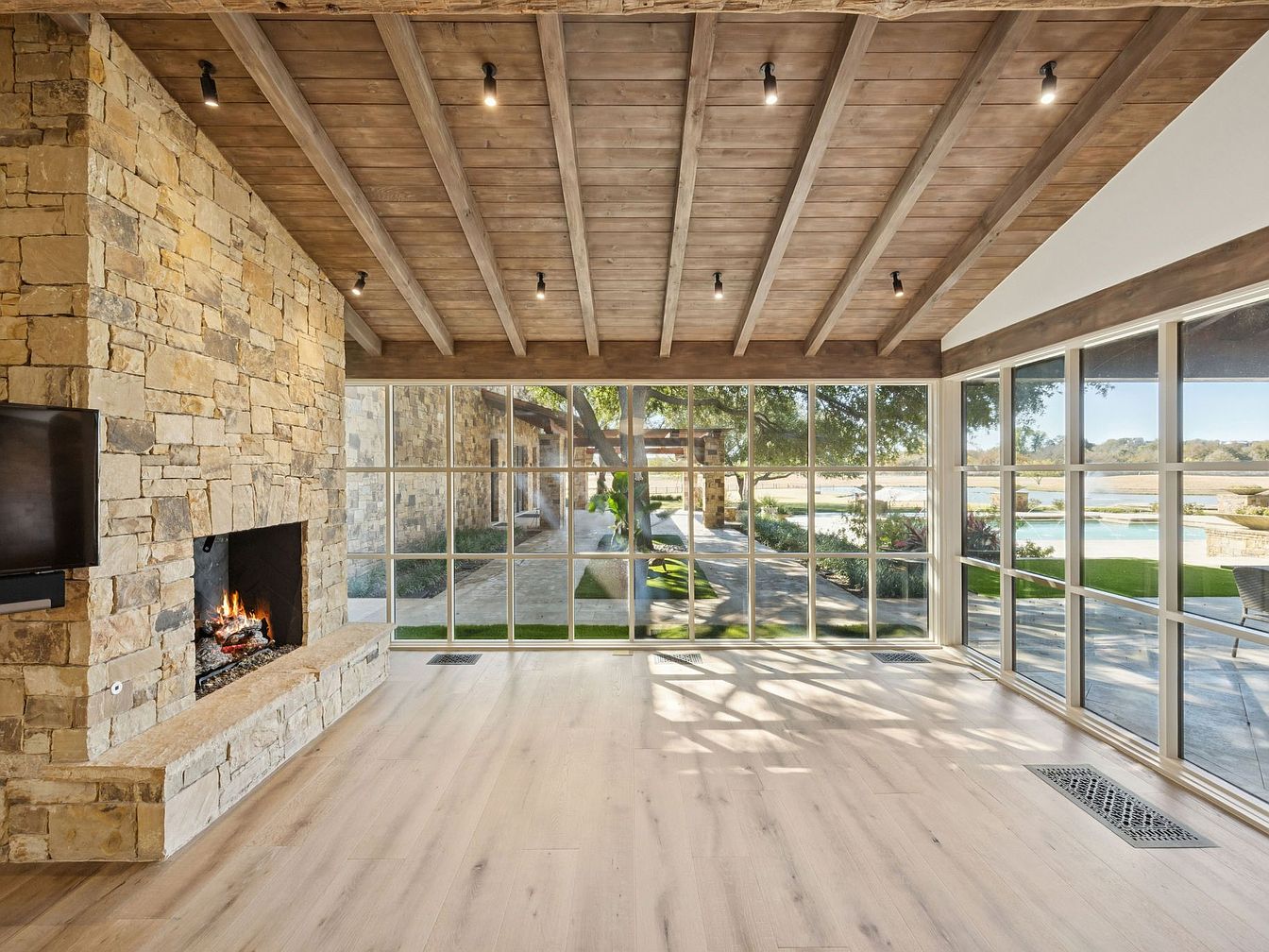 This inviting living room features a striking stone fireplace, providing a cozy focal point against a backdrop of light wood beams and a spacious open layout. Large floor-to-ceiling windows flood the space with natural light, seamlessly connecting indoor and outdoor living. The soft, neutral color palette enhances the serene atmosphere, complemented by warm wooden flooring. The room’s design promotes family togetherness, with ample space for gatherings. Recessed lighting adds to the modern aesthetic, while the elegant stonework adds character. Additional thoughtful features, such as easy access to the outdoor area and scenic views, enhance daily living.