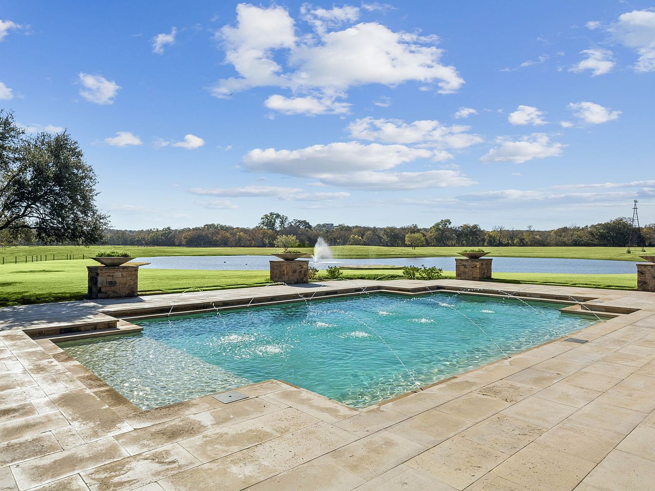 This serene backyard oasis features a stunning pool adorned with elegant stone accents and dynamic water features, perfect for family gatherings. The pool is flanked by beautifully crafted stone columns that add sophistication while offering a balance of outdoor aesthetics. A spacious stone patio invites relaxation, creating an ideal space for sunbathing and entertaining. The vibrant green lawn stretches towards a picturesque lake, enhancing the natural scenery and tranquility. Lush landscaping completes the vibrant ambiance, and the clear blue sky overhead offers a perfect backdrop, making this outdoor space a delightful retreat for all.