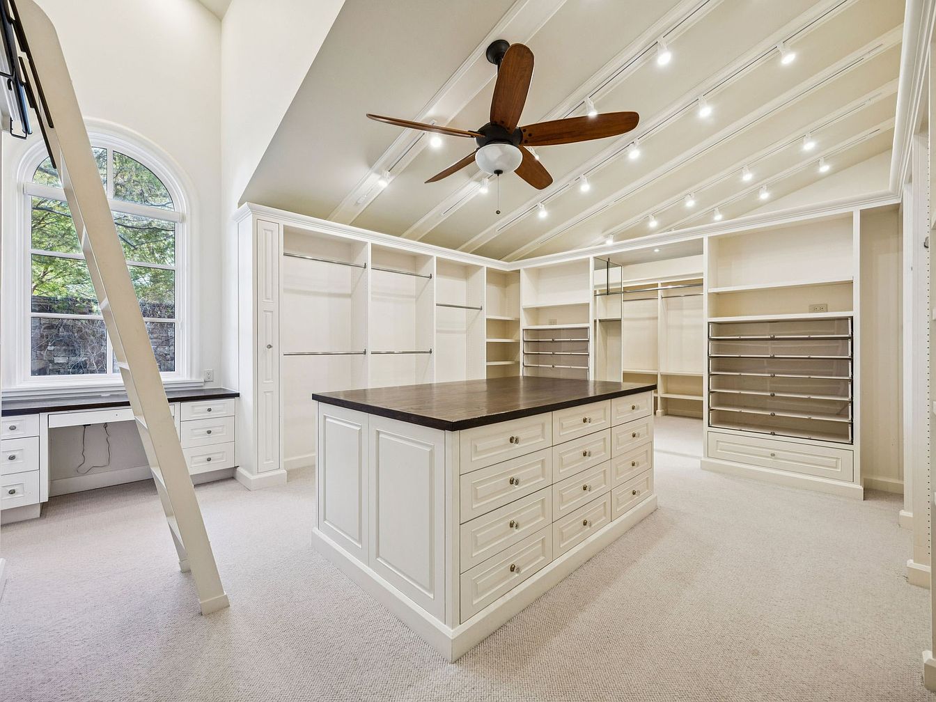 This beautifully designed walk-in closet features a high ceiling accentuated by exposed beams, enhancing the spacious feel. The creamy white cabinetry provides ample storage with built-in shelves, drawers, and hanging space, ensuring a clutter-free environment. A central island with a rich dark countertop serves as a functional surface for organizing belongings. Elegant lighting installations brighten the space, while large windows invite natural light, creating a warm ambiance. A stylish ladder complements the room, making it easy to access higher shelves. This family-friendly design combines aesthetics with practicality, making it an ideal organization hub for any home.