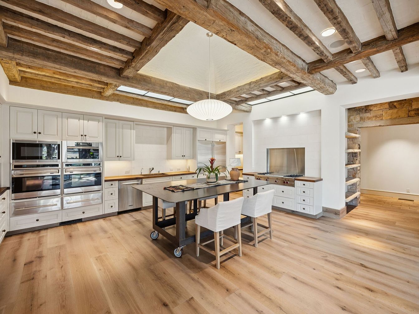 This inviting kitchen blends rustic charm with modern functionality. Exposed wooden beams stretch across the ceiling, adding warmth to the bright, open layout. A central island features a sleek design with a contrasting wooden top, perfect for casual dining or meal preparation. Stainless steel appliances line the wall, providing an efficient cooking experience, while the soft color palette of white cabinetry and pale wooden floors enhances a spacious feel. Family-friendly elements include an accessible design with ample counter space and seating. The incorporation of natural light through generous windows elevates the cheerful atmosphere, making it a nurturing space for gatherings.