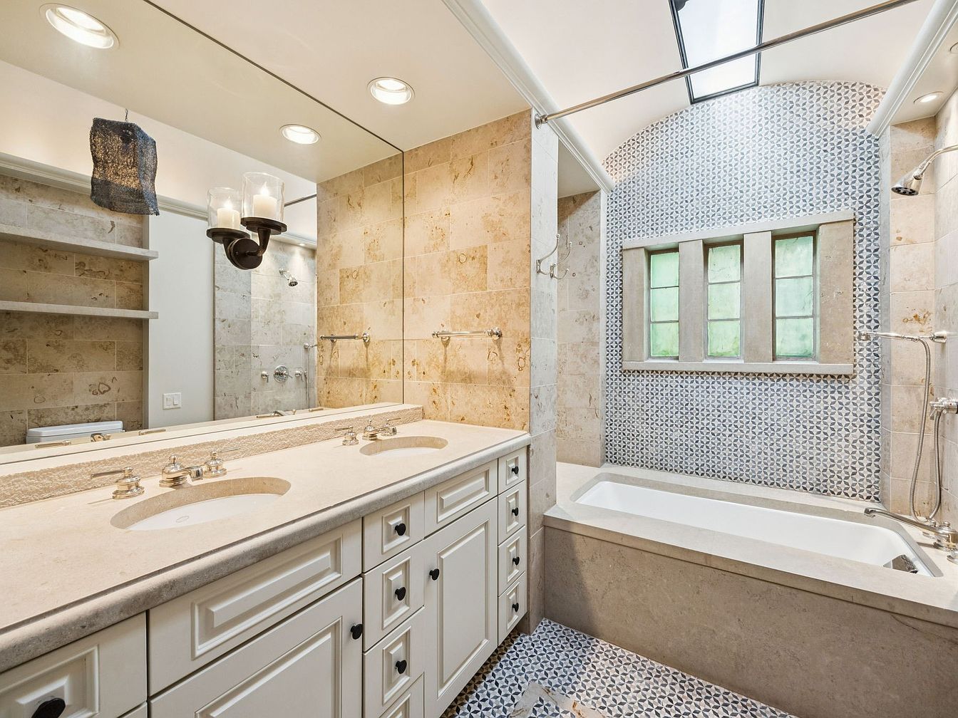 This spacious bathroom features a harmonious blend of contemporary design and classic charm. The dual vanity with chic faucets, backed by a large mirror, enhances functionality while exuding sophistication. Soft beige and warm cream tones create a soothing color palette, complemented by natural stone tiles and accents, establishing a spa-like ambience. Architectural details, including a skylight and decorative window, flood the space with natural light, making it feel open and inviting. Shelving provides practical storage, while the elegant soaking tub invites relaxation. This bathroom seamlessly combines style and comfort, ideal for families seeking a tranquil retreat.
