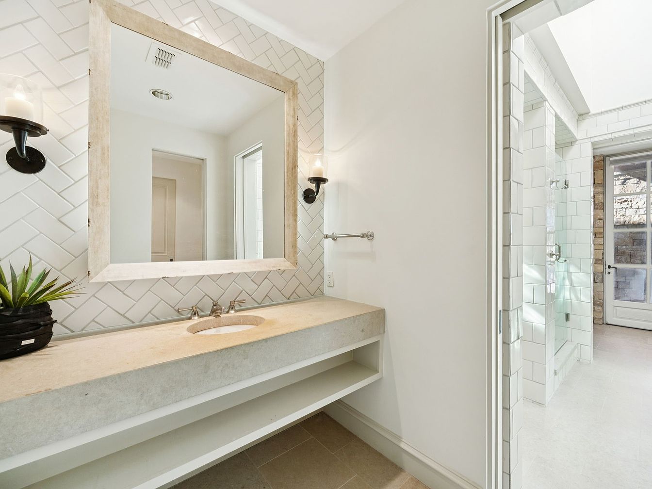 This contemporary bathroom features a spacious layout with a sleek, floating concrete vanity that complements the elegant herringbone pattern of the backsplash. Accentuated by two wall sconces, the natural light softens the neutral color palette, creating a calming atmosphere. The large mirror enhances depth while providing practical functionality. With built-in shelving beneath the vanity, it offers ample storage without sacrificing style. A walk-in shower, illuminated by natural light from frosted glass doors, showcases stylish tile work and modern fixtures. Perfect for families, this serene space effortlessly combines luxury with practicality, ensuring a delightful daily routine.