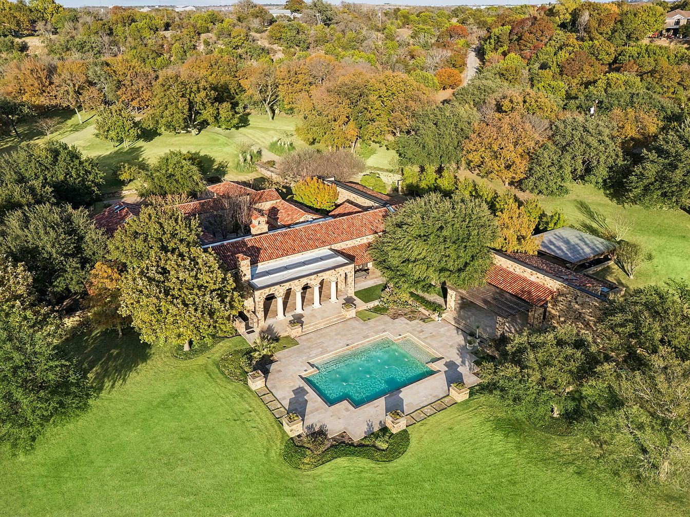 Set amidst lush greenery, this stunning outdoor oasis features a beautifully designed swimming pool, perfect for family fun. The elegant stone architecture combines rustic charm with modern comfort, accentuated by terracotta roof tiles that echo traditional styles. Surrounding the pool, meticulously landscaped gardens create a serene environment ideal for relaxation and play. Spacious patios encourage outdoor gatherings, with ample seating for entertaining guests. The harmonious blend of natural stone and vibrant landscaping offers a warm, inviting atmosphere. This property encapsulates luxury living while providing a friendly space for family activities and enjoying nature’s beauty.