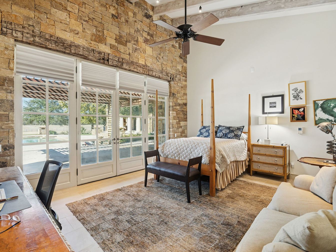 This serene master bedroom combines rustic charm with modern elegance, featuring a stunning stone accent wall that adds texture and warmth. A four-poster bed adorned with soft linens takes center stage, complemented by a cozy seating area with a plush loveseat. Large French doors invite abundant natural light and seamless access to outdoor views, enhancing the airy ambiance. The color palette blends earthy tones with subtle accents, creating a calm, inviting atmosphere. Functional furniture includes a stylish nightstand and a streamlined desk, perfect for family-friendly living. Exposed wooden beams on the ceiling provide architectural interest and character.