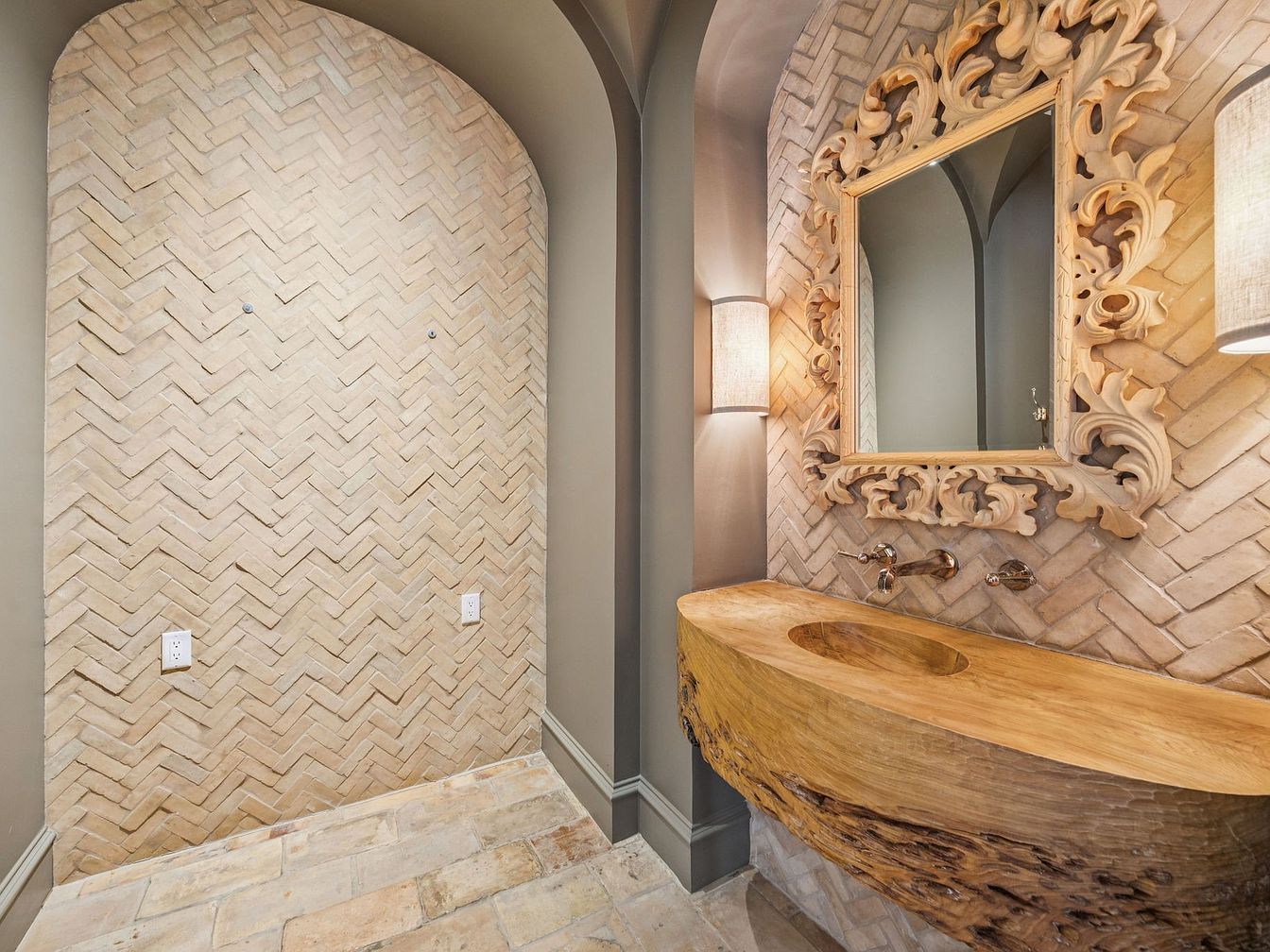 This elegantly designed bathroom combines rustic and contemporary elements, featuring a stunning herringbone-pattern brick wall that adds texture and warmth. A unique, handcrafted wooden vanity with a round sink serves as a focal point, enhancing the natural aesthetic. The ornate mirror complements the space with its intricate carvings, reflecting a blend of artistry and craftsmanship. Soft lighting from sconces flanking the mirror provides a cozy ambiance, while neutral tones create a calming atmosphere. The layout emphasizes both functionality and style, making it a perfect sanctuary for family members to unwind and refresh in an inviting environment.