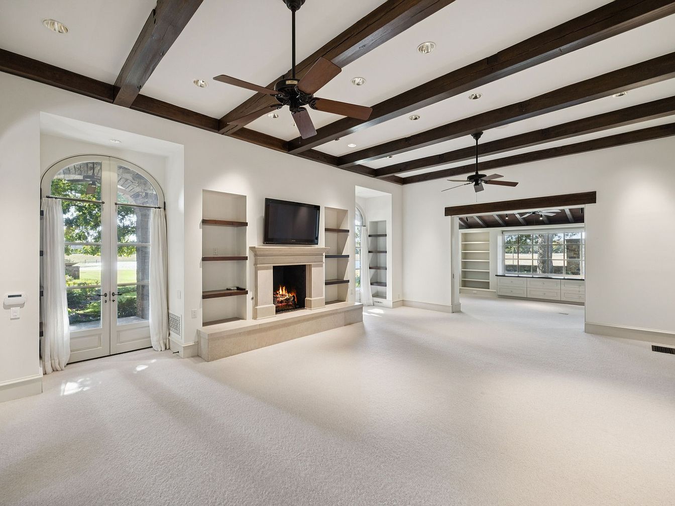 This spacious living room features elegant design with exposed wooden beams that create a warm, inviting atmosphere. The light-colored walls enhance brightness, while plush carpeting offers comfort underfoot. A central fireplace provides a cozy focal point, framed by built-in shelves perfect for displaying cherished items. Large windows invite nature indoors, allowing natural light to flood the space. Dual ceiling fans circulate air, ensuring a comfortable environment. The open layout connects seamlessly to an adjacent room, making it perfect for family gatherings or entertaining. The neutral color palette complements various decor styles, making it a versatile living area.