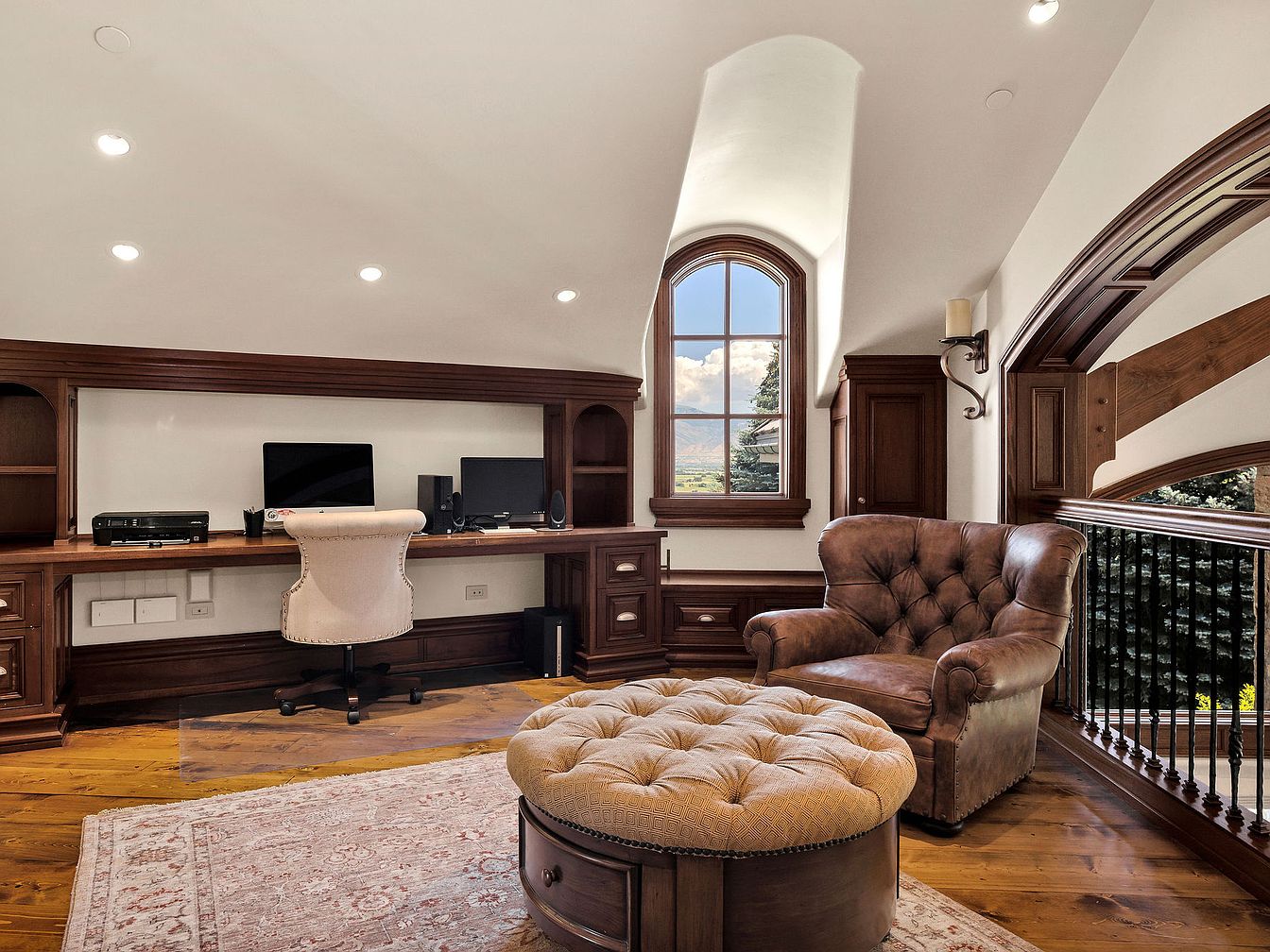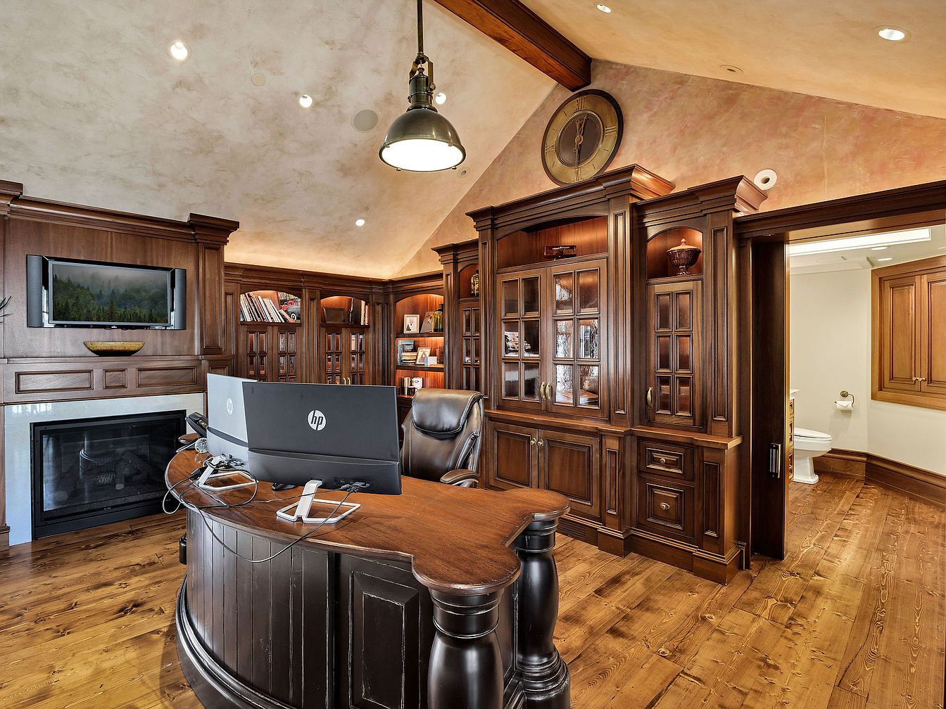 This sophisticated home office features rich mahogany cabinetry and a custom wood desk that combines elegance with functionality. The warm color palette, highlighted by the natural light spilling in, creates an inviting atmosphere ideal for productivity. A sleek black ergonomic chair complements the modern tech setup, seamlessly integrating into the classic design. Built-in shelves display books and personal mementos, enhancing the space’s personal touch. A cozy fireplace adds warmth, while the architectural details—such as the exposed beams and vaulted ceiling—are accentuated by subtle recessed lighting. A convenient half-bathroom accessibility ensures practicality for a family-friendly environment.
