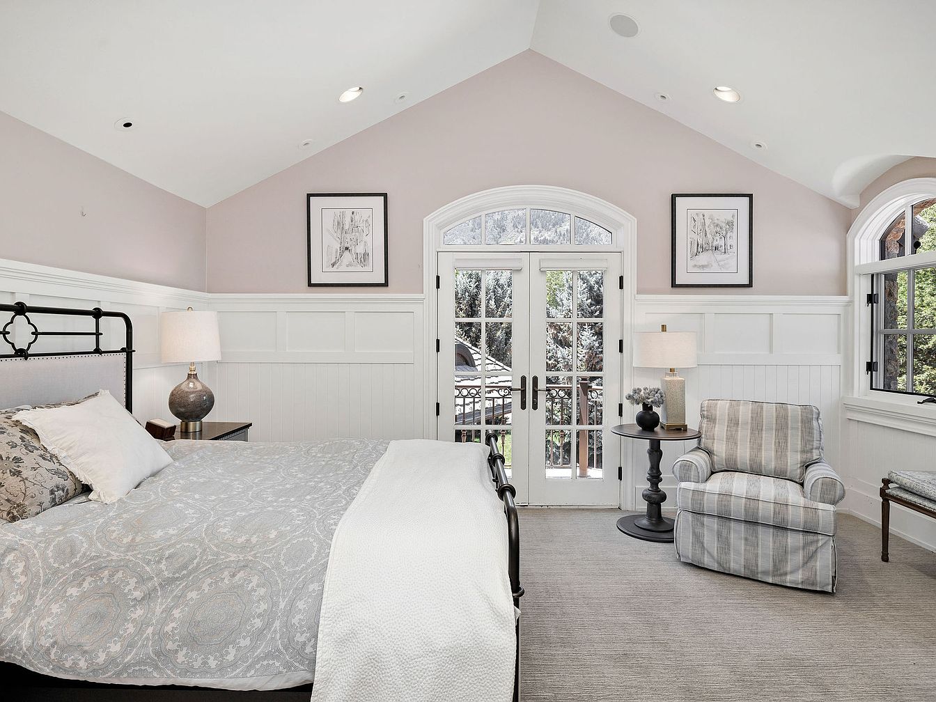 This master bedroom features a stunning vaulted ceiling accentuated by natural light filtering through windows framed by elegant moldings. The soft, pastel pink walls create a serene ambiance, perfectly complemented by the classic wainscoting. A sophisticated iron bed, draped with a tasteful light gray quilt, is the focal point, while a stylish side table holds a modern lamp, providing both function and style. A cozy armchair in soft stripes invites relaxation, making this space family-friendly and inviting. The double doors lead to a balcony, seamlessly connecting indoor and outdoor living, perfect for enjoying morning coffee or evening breezes.