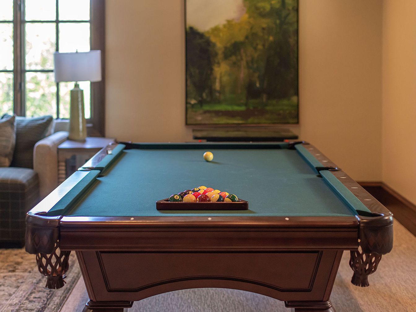 This inviting game room features a beautifully crafted pool table as the centerpiece, framed by warm, inviting colors and tasteful decor. The rich mahogany finish of the table complements the soft hues of the walls, creating a cozy atmosphere perfect for family gatherings. Plush seating nearby, coupled with a stylish lamp, provides an inviting corner for relaxation. Natural light floods in through large windows adorned with elegant drapes, enhancing the space’s warmth. A striking landscape painting adds a touch of sophistication, while the overall design promotes a welcoming environment, ideal for entertaining friends and family.